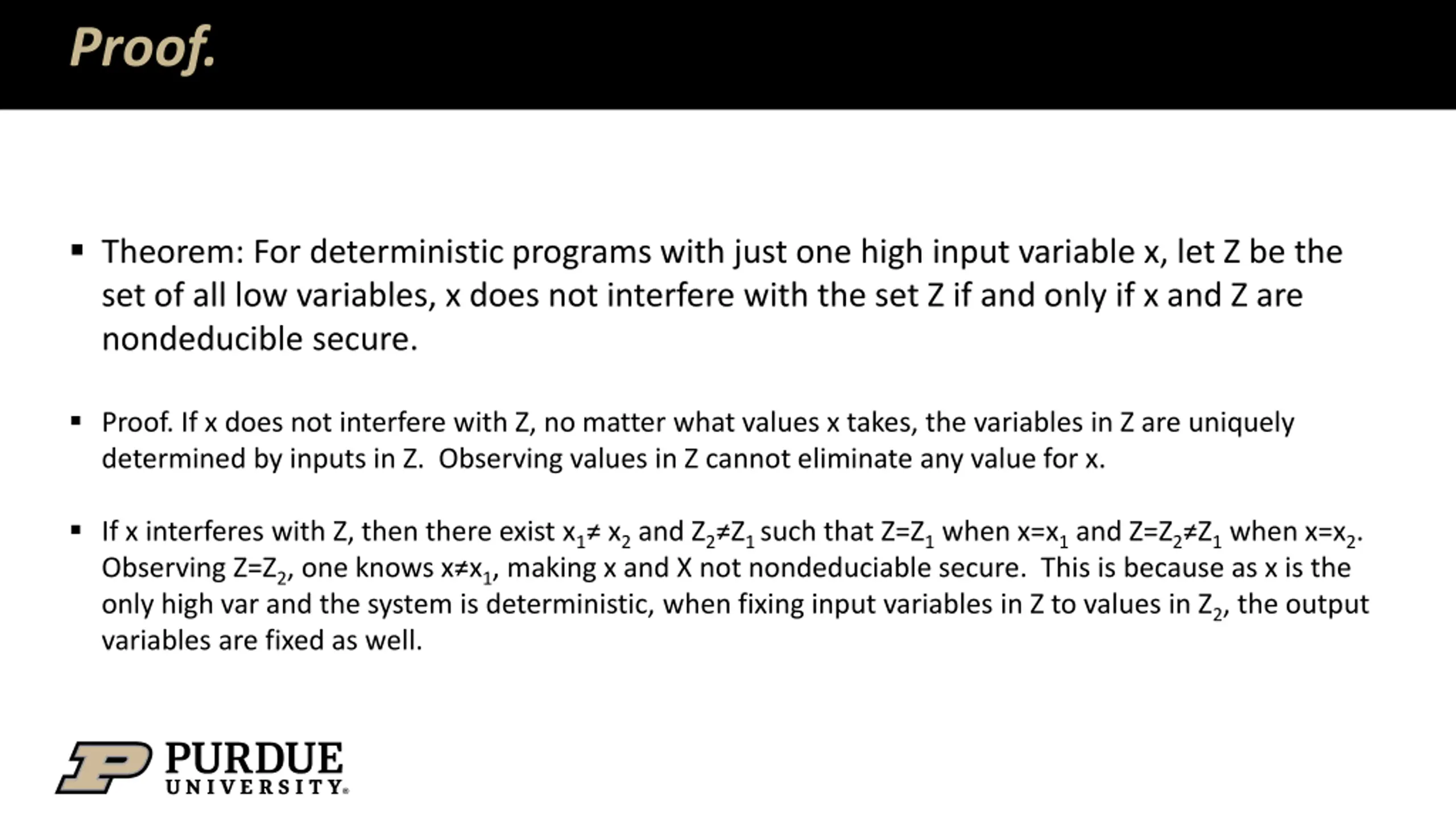 Proof. Theorem: For deterministic programs with just one high input variable x, let Z be the set of all low variables, x does not interfere with the set Z if and only if x and Z are nondeducible secure. Proof. If x does not interfere with Z, no matter what values x takes, the variables in Z are uniquely determined by inputs in Z. Observing values in Z cannot eliminate any value for x. If x interferes with Z, then there exist x1 x2 and Z2 Z1 such that Z=Z1 when x=x1 and Z=Z2 Z1 when x=x2. Observing Z=Z2, one knows x x1, making x and X not nondeduciable secure. This is because as x is the only high var and the system is deterministic, when fixing input variables in Z to values in Z2, the output variables are fixed as well.