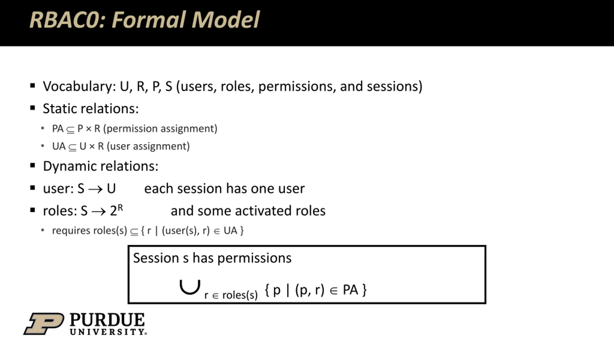 RBAC0: Formal Model Vocabulary: U, R, P, S (users, roles, permissions, and sessions) Static relations: PA P R (permission assignment) UA U R (user assignment) Dynamic relations: user: S U each session has one user roles: S 2R and some activated roles requires roles(s) { r | (user(s), r) UA } Session s has permissions r roles(s) { p | (p, r) PA }