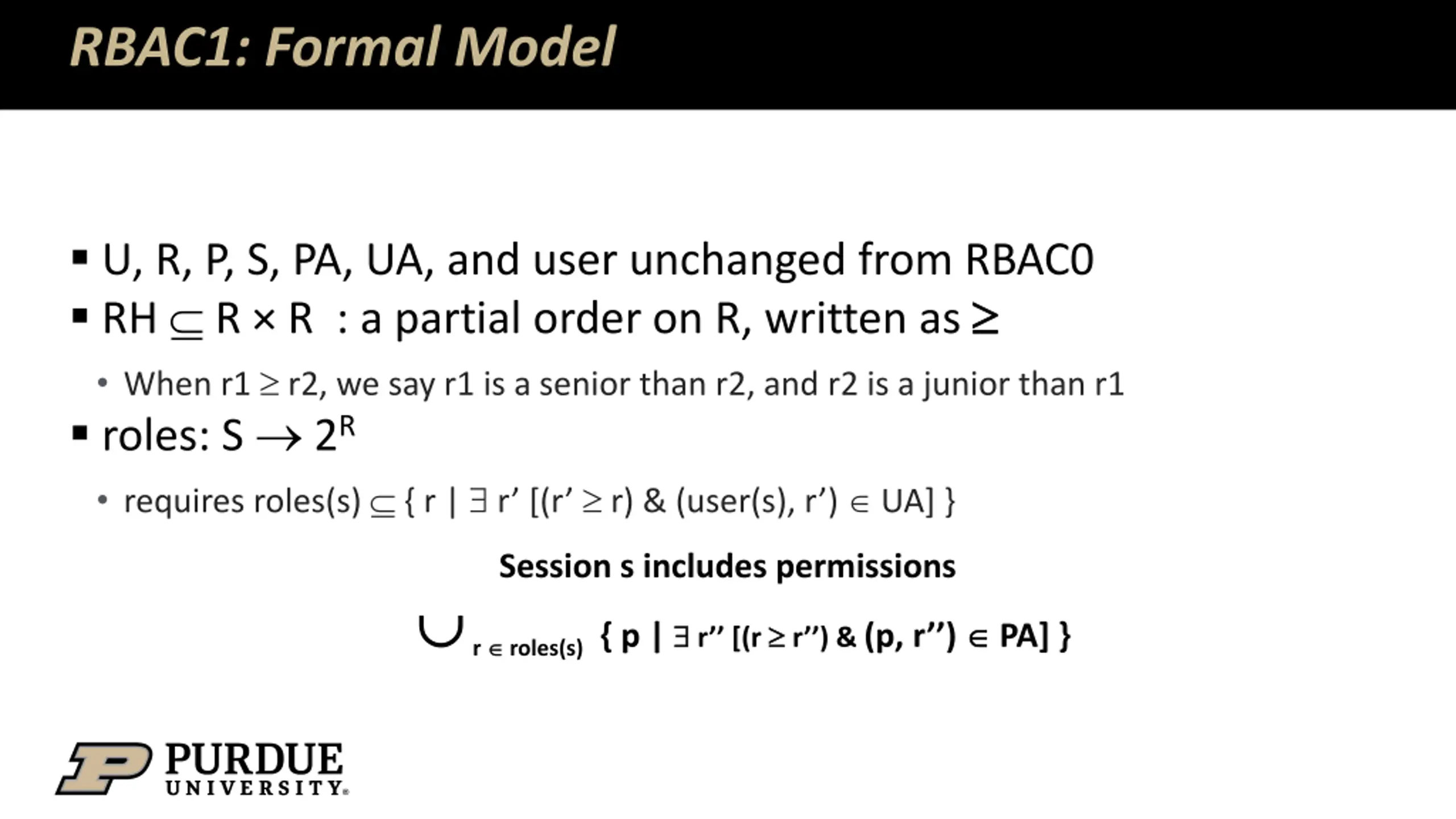 RBAC1: Formal Model U, R, P, S, PA, UA, and user unchanged from RBAC0 RH R R : a partial order on R, written as When r1 r2, we say r1 is a senior than r2, and r2 is a junior than r1 roles: S 2R requires roles(s) { r | r [(r r) & (user(s), r ) UA] } Session s includes permissions r roles(s) { p | r [(r r ) & (p, r ) PA] }