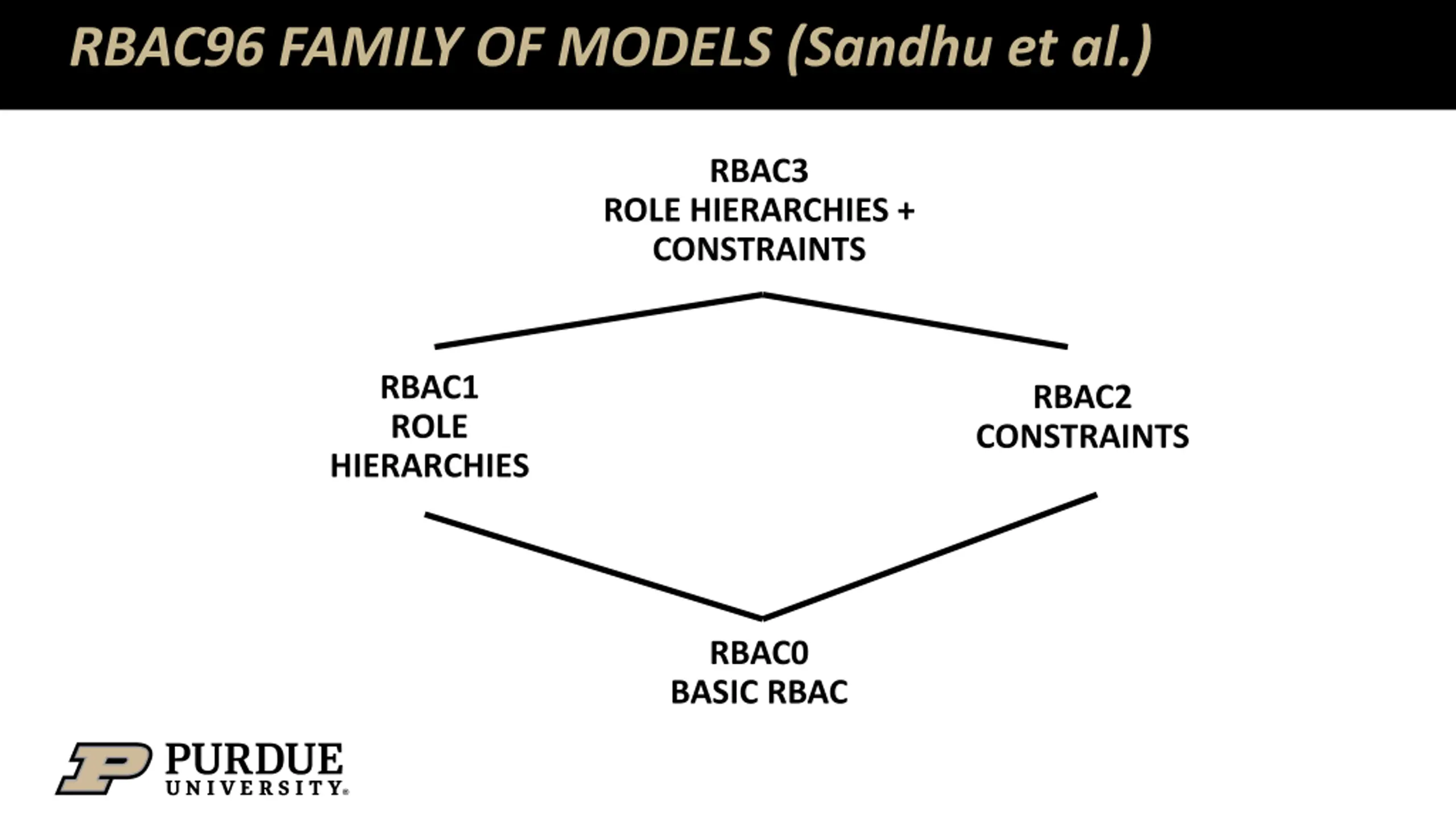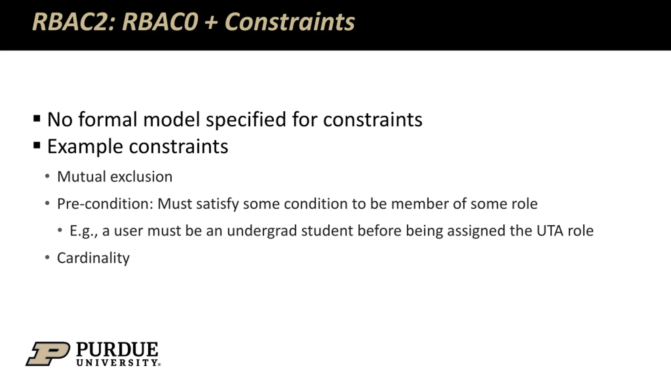 RBAC2: RBAC0 + Constraints No formal model specified for constraints Example constraints Mutual exclusion Pre-condition: Must satisfy some condition to be member of some role E.g., a user must be an undergrad student before being assigned the UTA role Cardinality