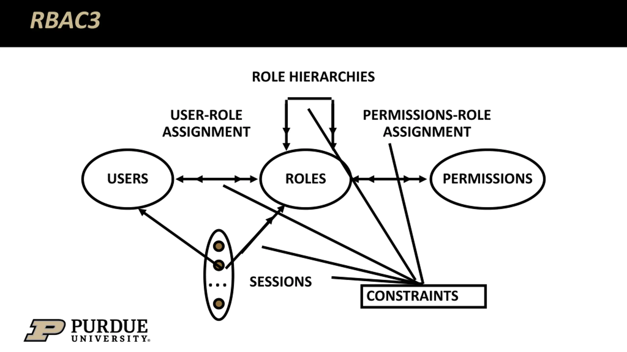 RBAC3 ROLE HIERARCHIES USER-ROLE ASSIGNMENT PERMISSIONS-ROLE ASSIGNMENT USERS ROLES PERMISSIONS ... SESSIONS CONSTRAINTS