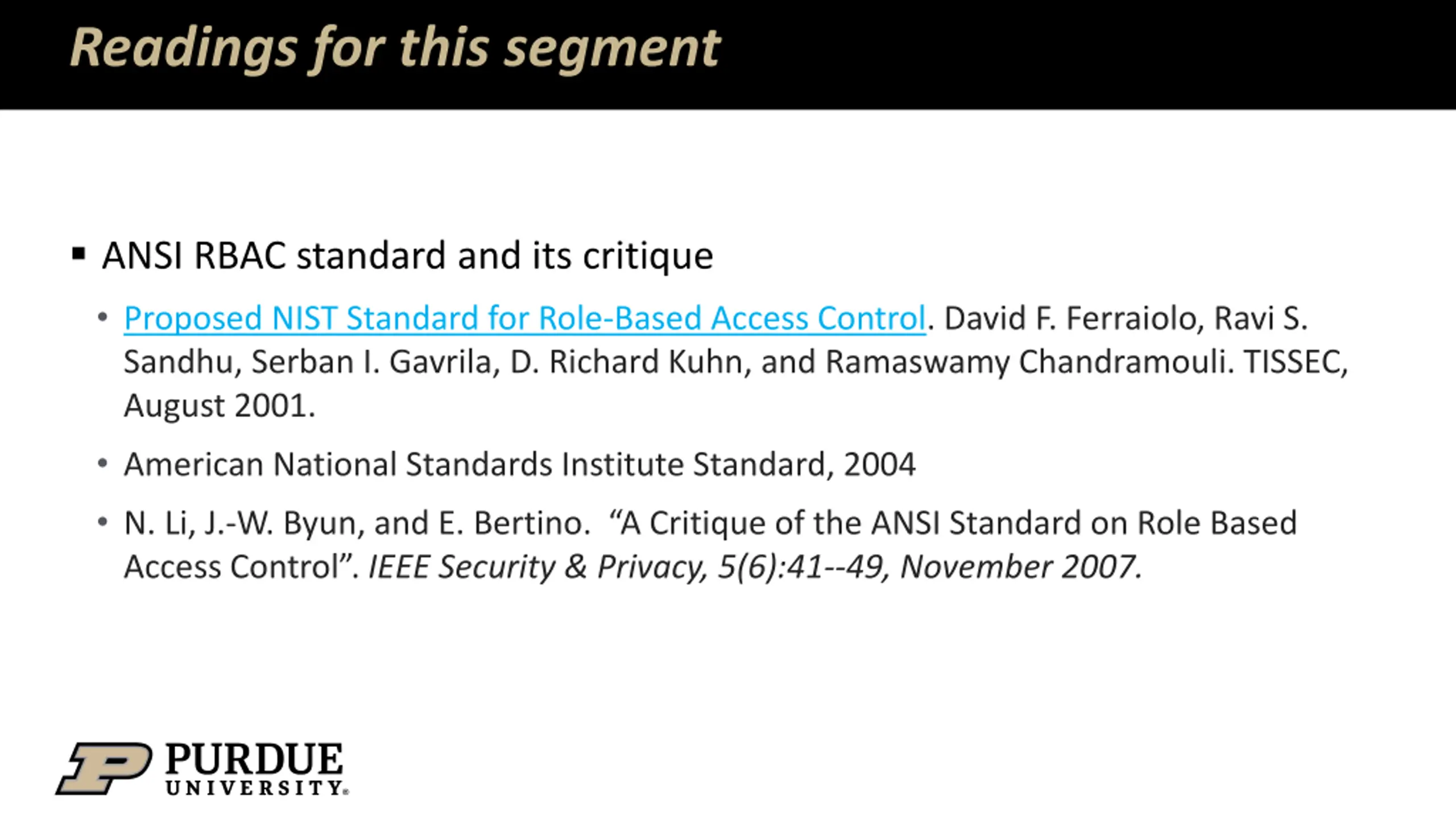 Readings for this segment ANSI RBAC standard and its critique Proposed NIST Standard for Role-Based Access Control. David F. Ferraiolo, Ravi S. Sandhu, Serban I. Gavrila, D. Richard Kuhn, and Ramaswamy Chandramouli. TISSEC, August 2001. American National Standards Institute Standard, 2004 N. Li, J.-W. Byun, and E. Bertino. A Critique of the ANSI Standard on Role Based Access Control . IEEE Security & Privacy, 5(6):41--49, November 2007.