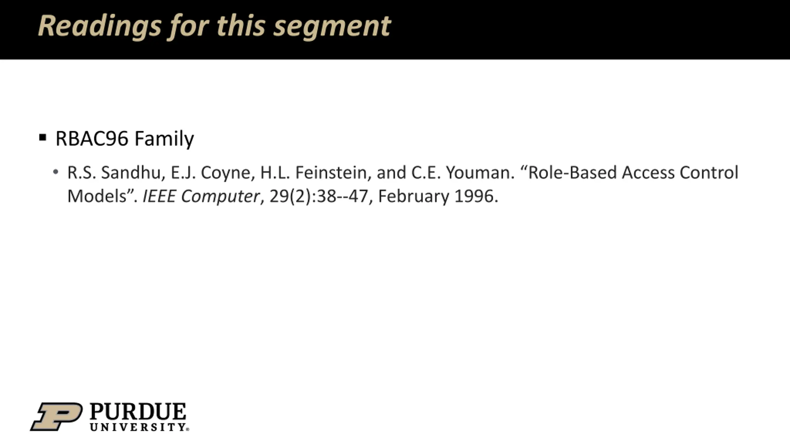 Readings for this segment RBAC96 Family R.S. Sandhu, E.J. Coyne, H.L. Feinstein, and C.E. Youman. Role-Based Access Control Models . IEEE Computer, 29(2):38--47, February 1996.