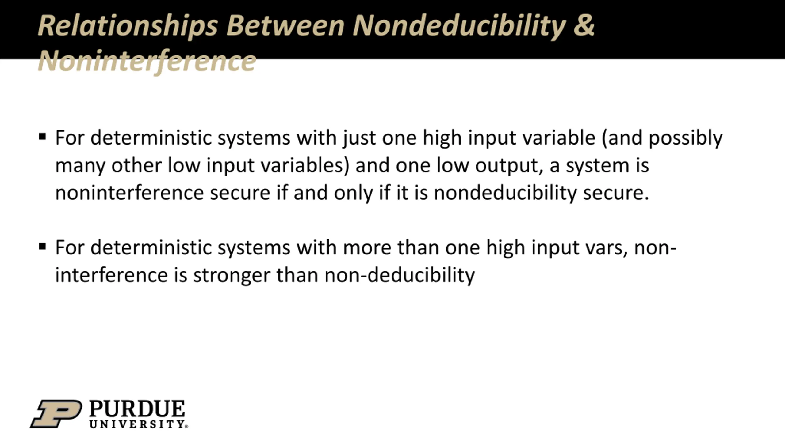 Relationships Between Nondeducibility & Noninterference For deterministic systems with just one high input variable (and possibly many other low input variables) and one low output, a system is noninterference secure if and only if it is nondeducibility secure. For deterministic systems with more than one high input vars, non- interference is stronger than non-deducibility
