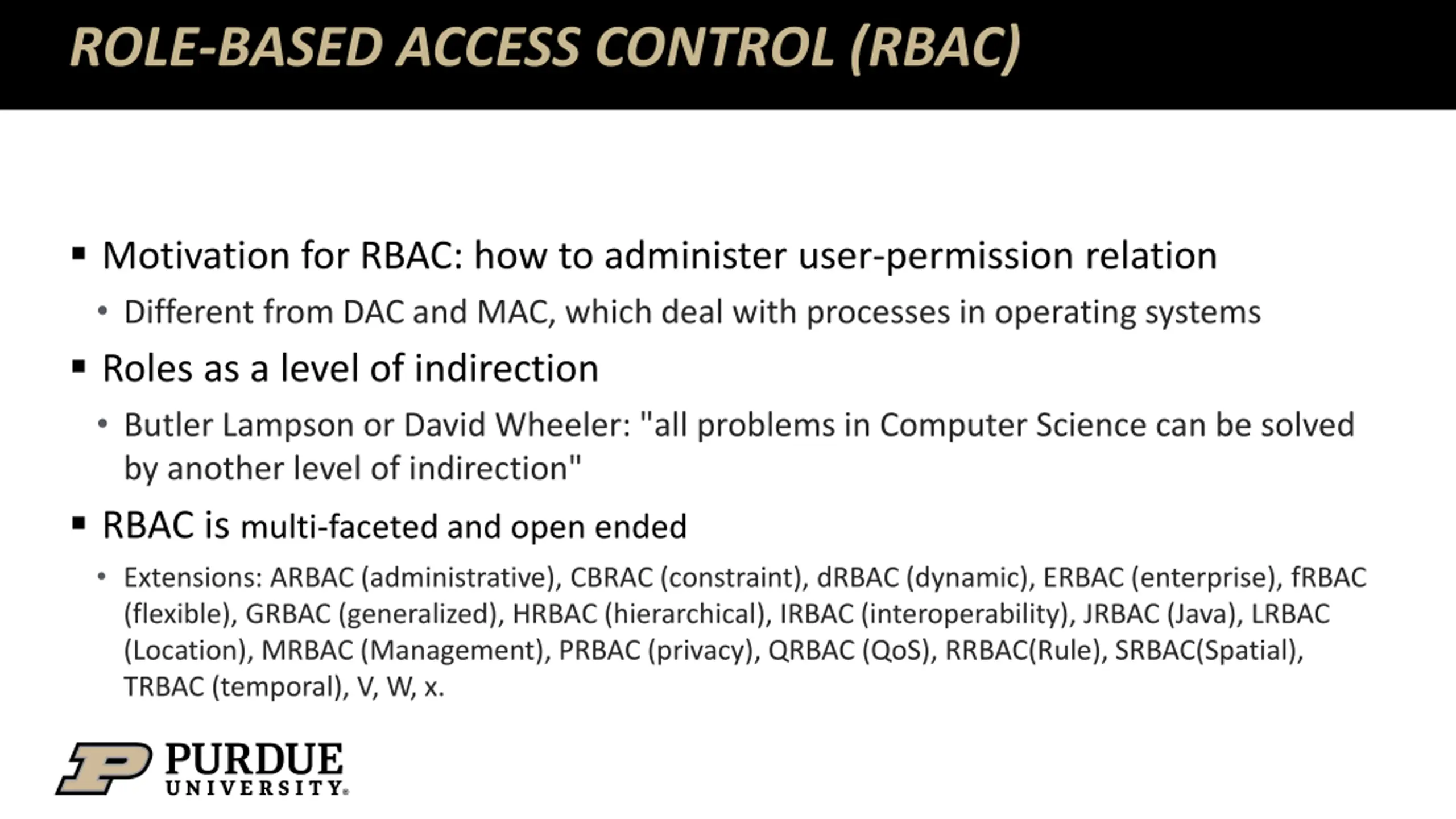 ROLE-BASED ACCESS CONTROL (RBAC) Motivation for RBAC: how to administer user-permission relation Different from DAC and MAC, which deal with processes in operating systems Roles as a level of indirection Butler Lampson or David Wheeler: "all problems in Computer Science can be solved by another level of indirection" RBAC is multi-faceted and open ended Extensions: ARBAC (administrative), CBRAC (constraint), dRBAC (dynamic), ERBAC (enterprise), fRBAC (flexible), GRBAC (generalized), HRBAC (hierarchical), IRBAC (interoperability), JRBAC (Java), LRBAC (Location), MRBAC (Management), PRBAC (privacy), QRBAC (QoS), RRBAC(Rule), SRBAC(Spatial), TRBAC (temporal), V, W, x.