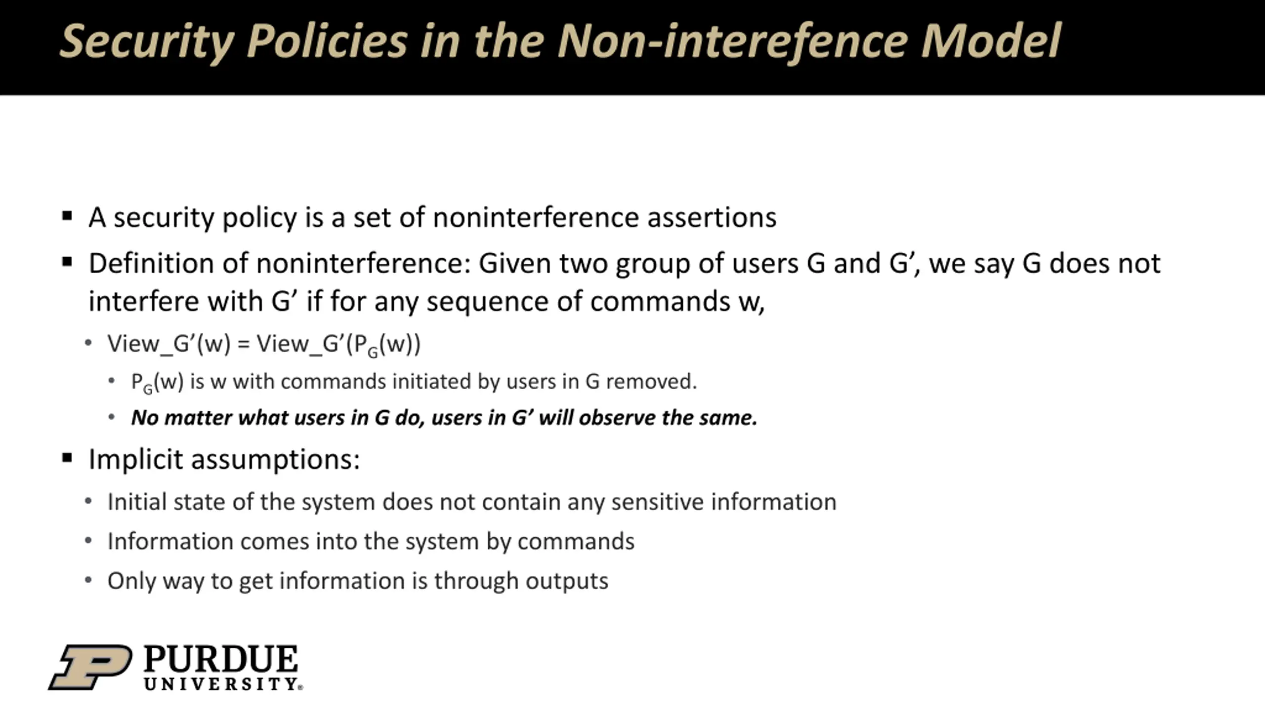 Security Policies in the Non-interefence Model A security policy is a set of noninterference assertions Definition of noninterference: Given two group of users G and G , we say G does not interfere with G if for any sequence of commands w, View_G (w) = View_G (PG(w)) PG(w) is w with commands initiated by users in G removed. No matter what users in G do, users in G will observe the same. Implicit assumptions: Initial state of the system does not contain any sensitive information Information comes into the system by commands Only way to get information is through outputs