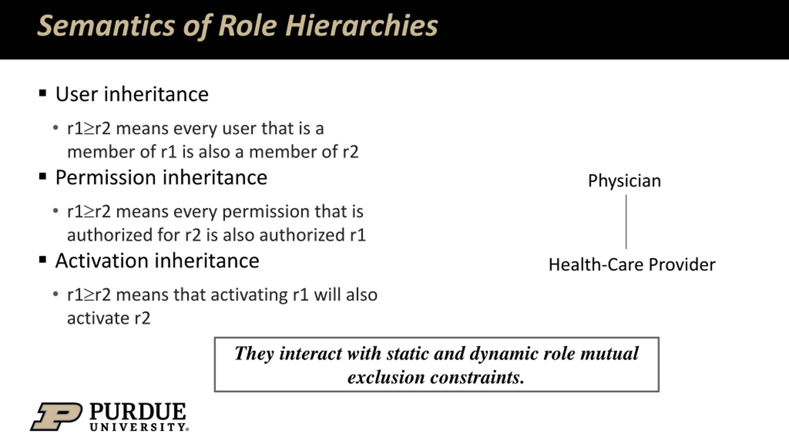 Semantics of Role Hierarchies User inheritance r1 r2 means every user that is a member of r1 is also a member of r2 Permission inheritance r1 r2 means every permission that is authorized for r2 is also authorized r1 Activation inheritance r1 r2 means that activating r1 will also activate r2 Physician Health-Care Provider They interact with static and dynamic role mutual exclusion constraints.