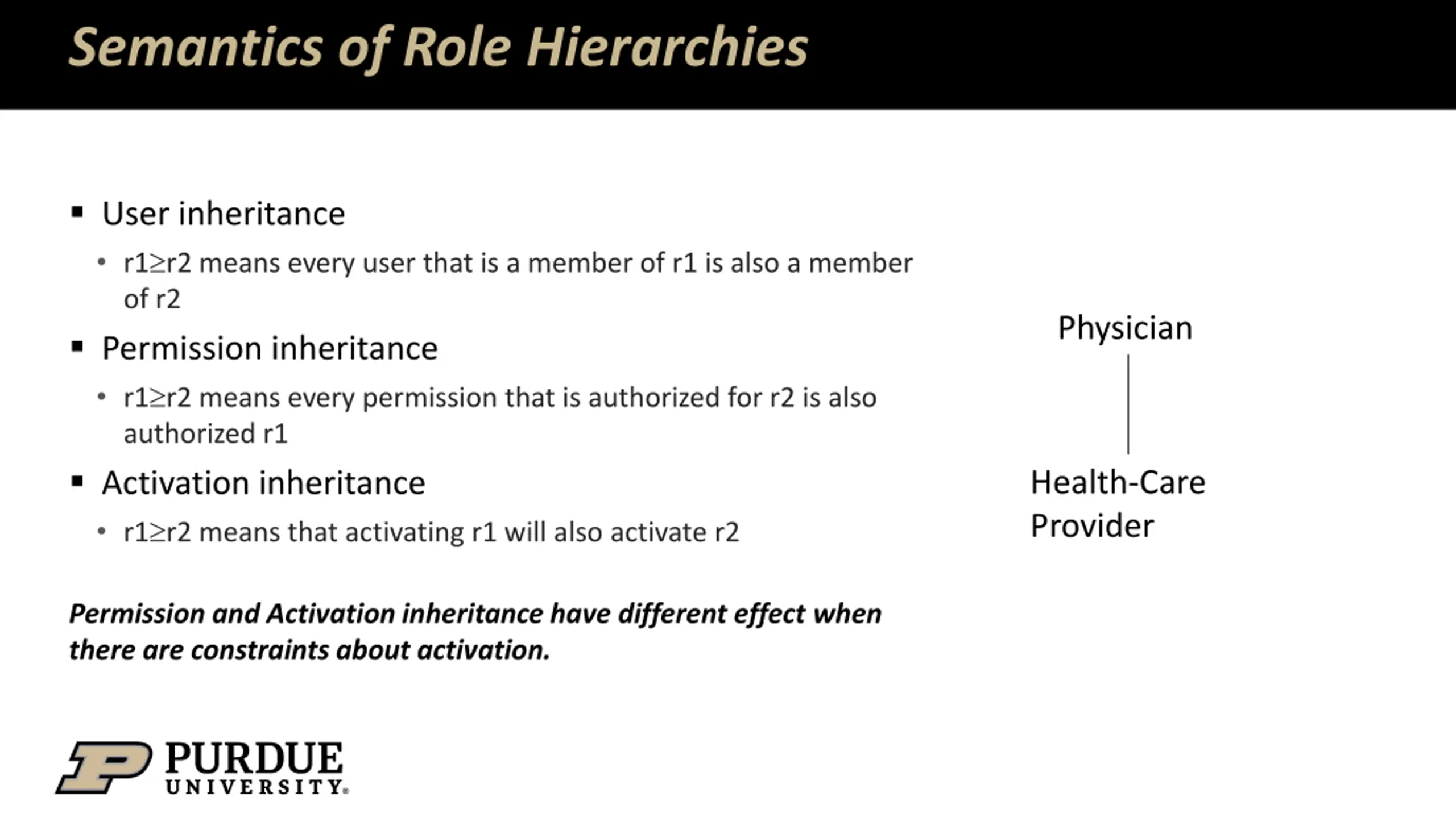 Semantics of Role Hierarchies User inheritance r1 r2 means every user that is a member of r1 is also a member of r2 Permission inheritance r1 r2 means every permission that is authorized for r2 is also authorized r1 Activation inheritance r1 r2 means that activating r1 will also activate r2 Physician Health-Care Provider Permission and Activation inheritance have different effect when there are constraints about activation.