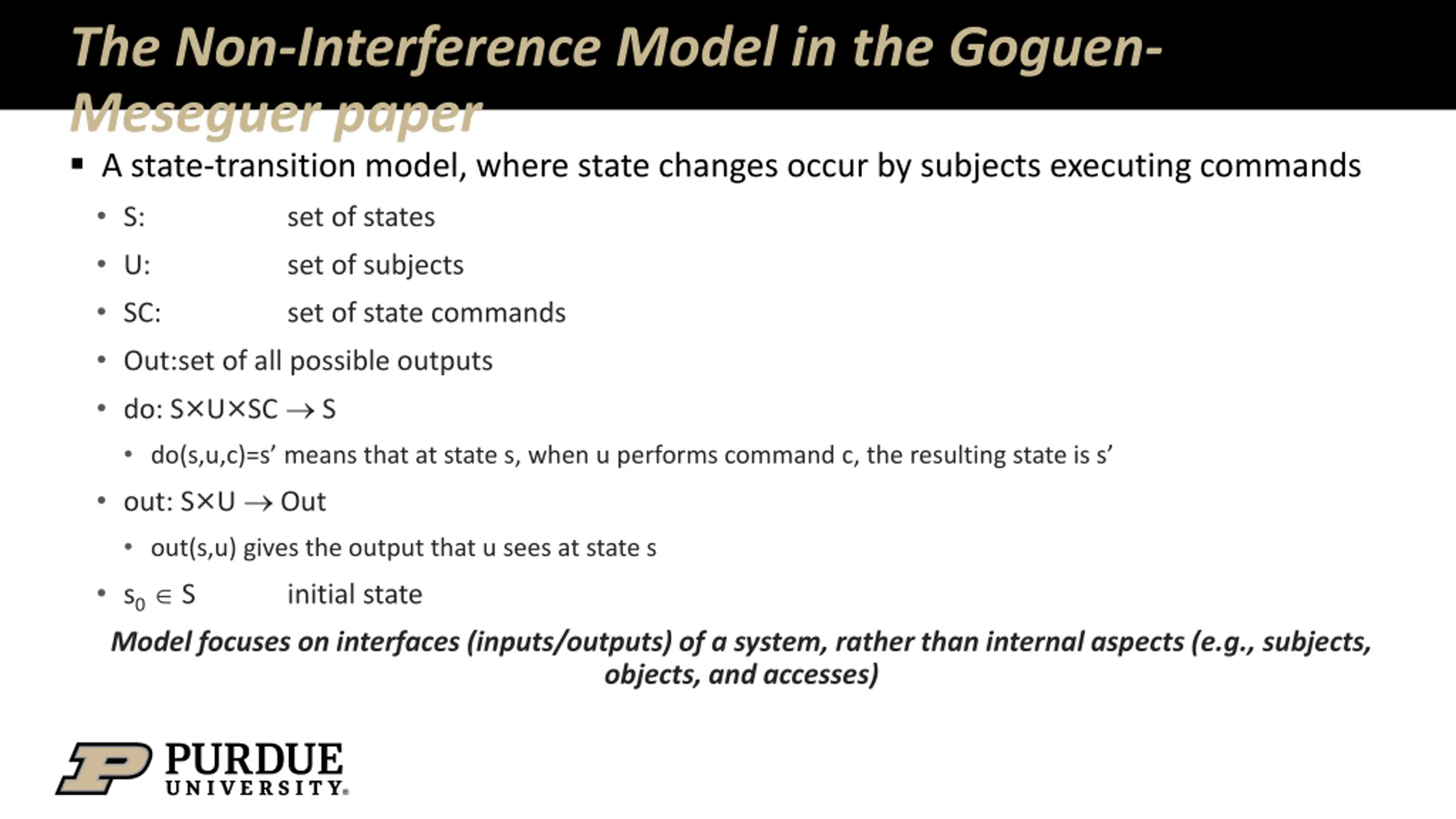 The Non-Interference Model in the Goguen- Meseguer paper A state-transition model, where state changes occur by subjects executing commands S: set of states U: set of subjects SC: set of state commands Out:set of all possible outputs do: S U SC S do(s,u,c)=s means that at state s, when u performs command c, the resulting state is s out: S U Out out(s,u) gives the output that u sees at state s s0 S initial state Model focuses on interfaces (inputs/outputs) of a system, rather than internal aspects (e.g., subjects, objects, and accesses)