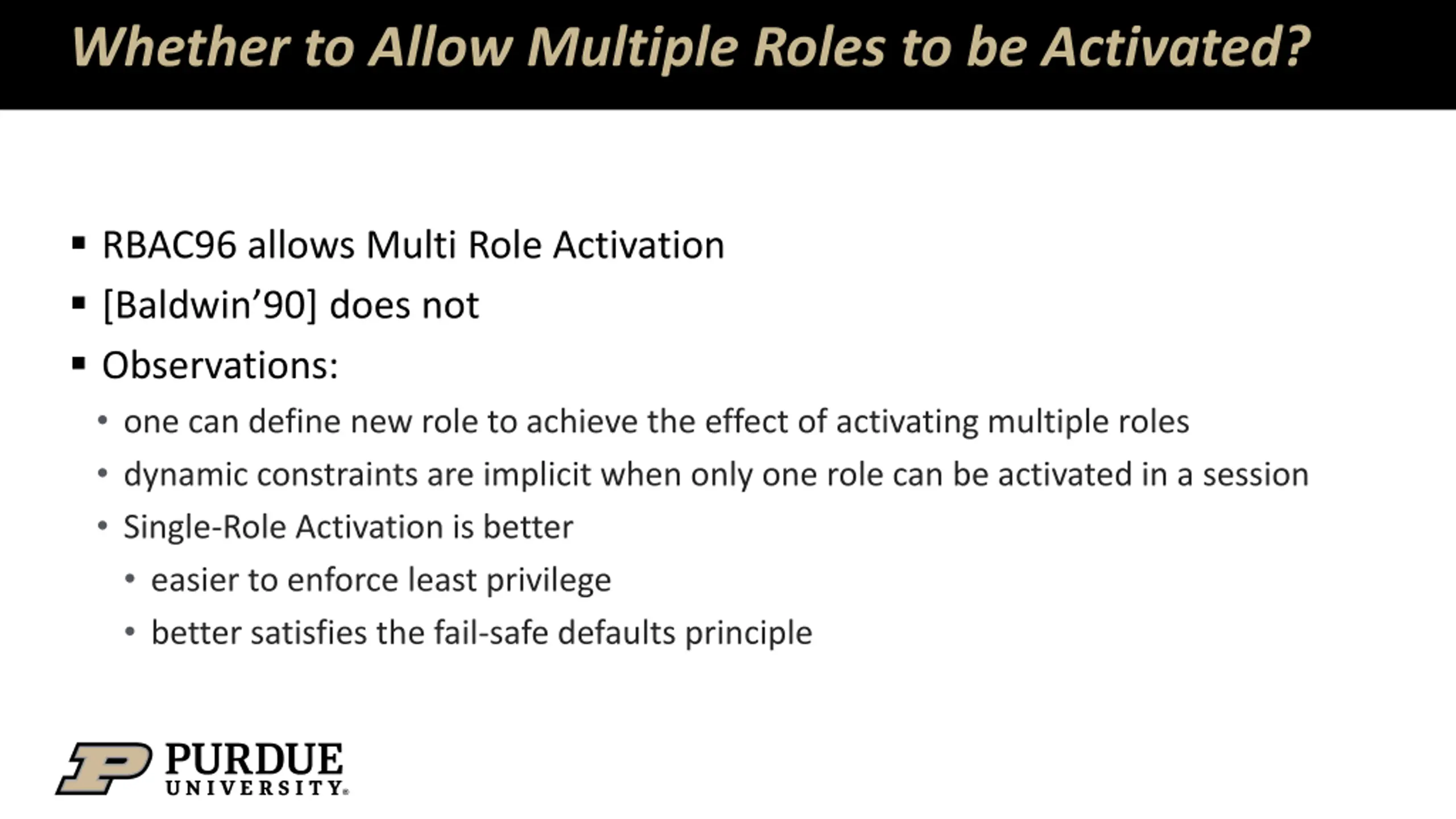 Whether to Allow Multiple Roles to be Activated? RBAC96 allows Multi Role Activation [Baldwin 90] does not Observations: one can define new role to achieve the effect of activating multiple roles dynamic constraints are implicit when only one role can be activated in a session Single-Role Activation is better easier to enforce least privilege better satisfies the fail-safe defaults principle