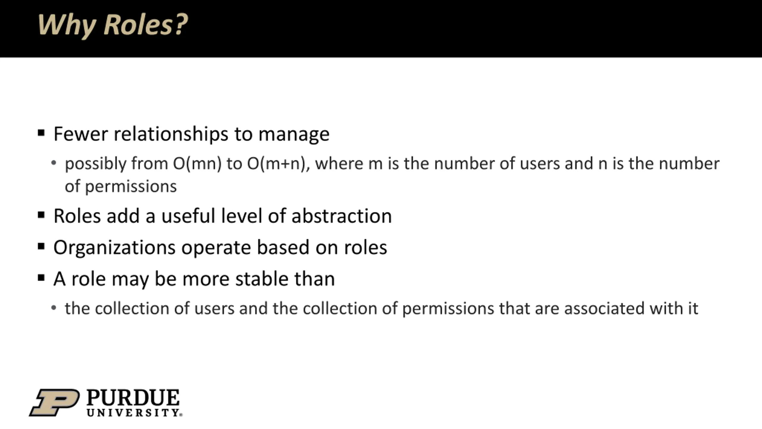 Why Roles? Fewer relationships to manage possibly from O(mn) to O(m+n), where m is the number of users and n is the number of permissions Roles add a useful level of abstraction Organizations operate based on roles A role may be more stable than the collection of users and the collection of permissions that are associated with it