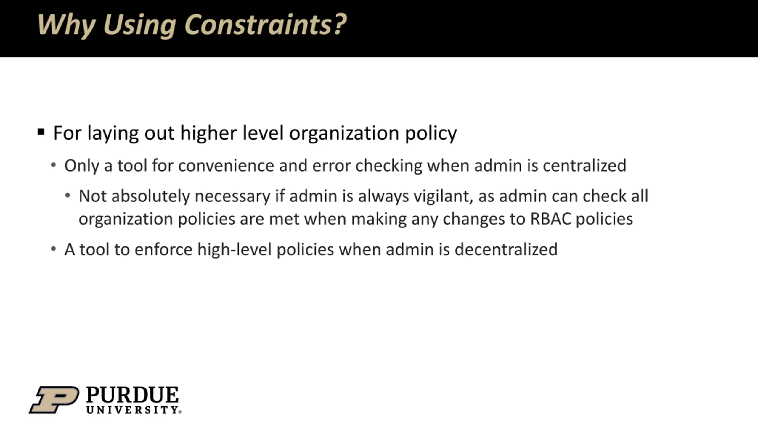 Why Using Constraints? For laying out higher level organization policy Only a tool for convenience and error checking when admin is centralized Not absolutely necessary if admin is always vigilant, as admin can check all organization policies are met when making any changes to RBAC policies A tool to enforce high-level policies when admin is decentralized