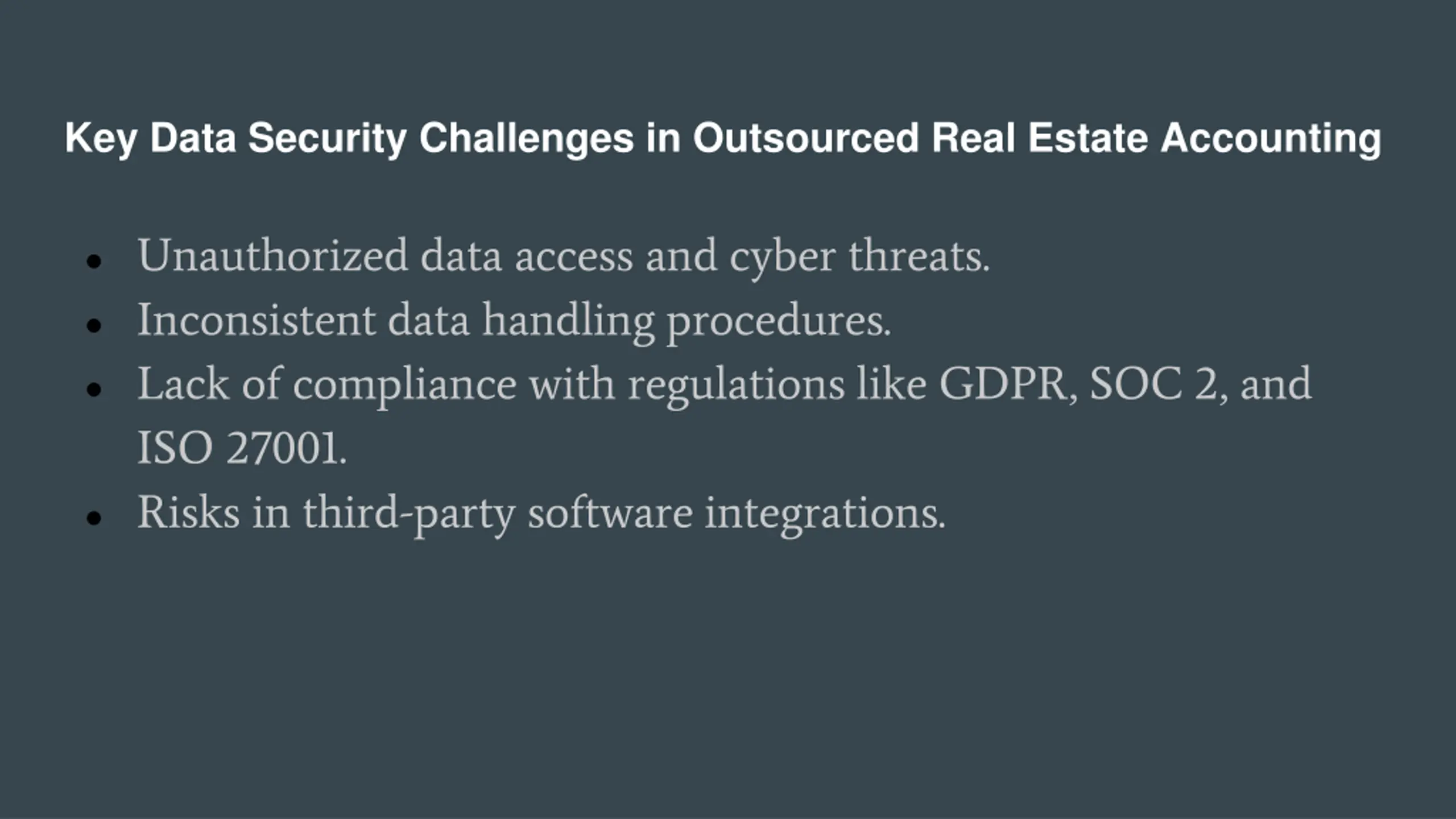 Key Data Security Challenges in Outsourced Real Estate Accounting Unauthorized data access and cyber threats. Inconsistent data handling procedures. Lack of compliance with regulations like GDPR, SOC 2, and ISO 27001. Risks in third-party software integrations.