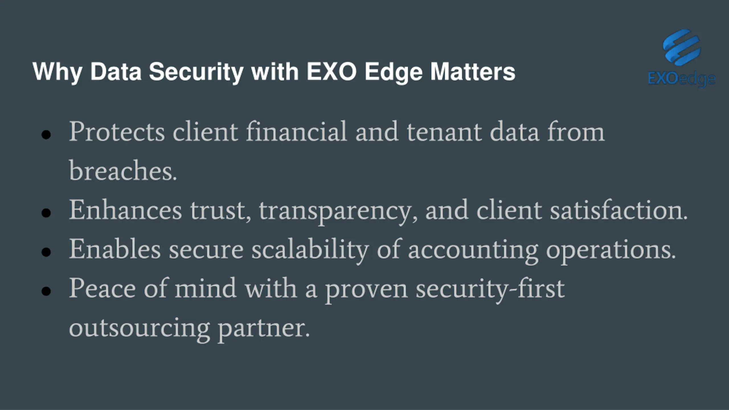 Why Data Security with EXO Edge Matters Protects client financial and tenant data from breaches. Enhances trust, transparency, and client satisfaction. Enables secure scalability of accounting operations. Peace of mind with a proven security-first outsourcing partner.