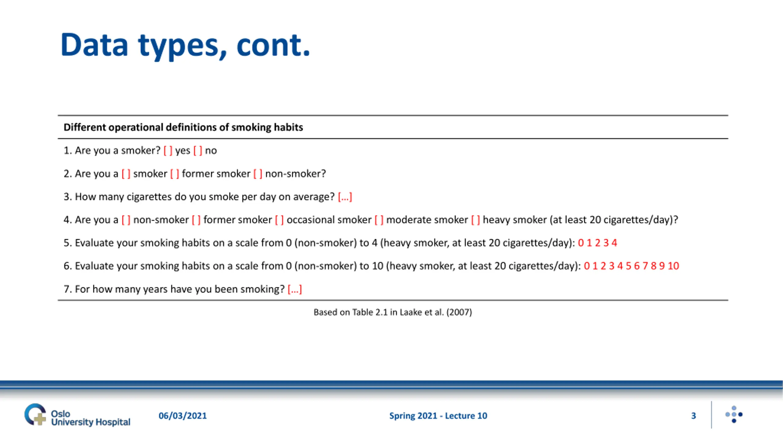 Data types, cont. Different operational definitions of smoking habits 1. Are you a smoker? [ ] yes [ ] no 2. Are you a [ ] smoker [ ] former smoker [ ] non-smoker? 3. How many cigarettes do you smoke per day on average? [ ] 4. Are you a [ ] non-smoker [ ] former smoker [ ] occasional smoker [ ] moderate smoker [ ] heavy smoker (at least 20 cigarettes/day)? 5. Evaluate your smoking habits on a scale from 0 (non-smoker) to 4 (heavy smoker, at least 20 cigarettes/day): 0 1 2 3 4 6. Evaluate your smoking habits on a scale from 0 (non-smoker) to 10 (heavy smoker, at least 20 cigarettes/day): 0 1 2 3 4 5 6 7 8 9 10 7. For how many years have you been smoking? [ ] Based on Table 2.1 in Laake et al. (2007) 06/03/2021 Spring 2021 - Lecture 10 3