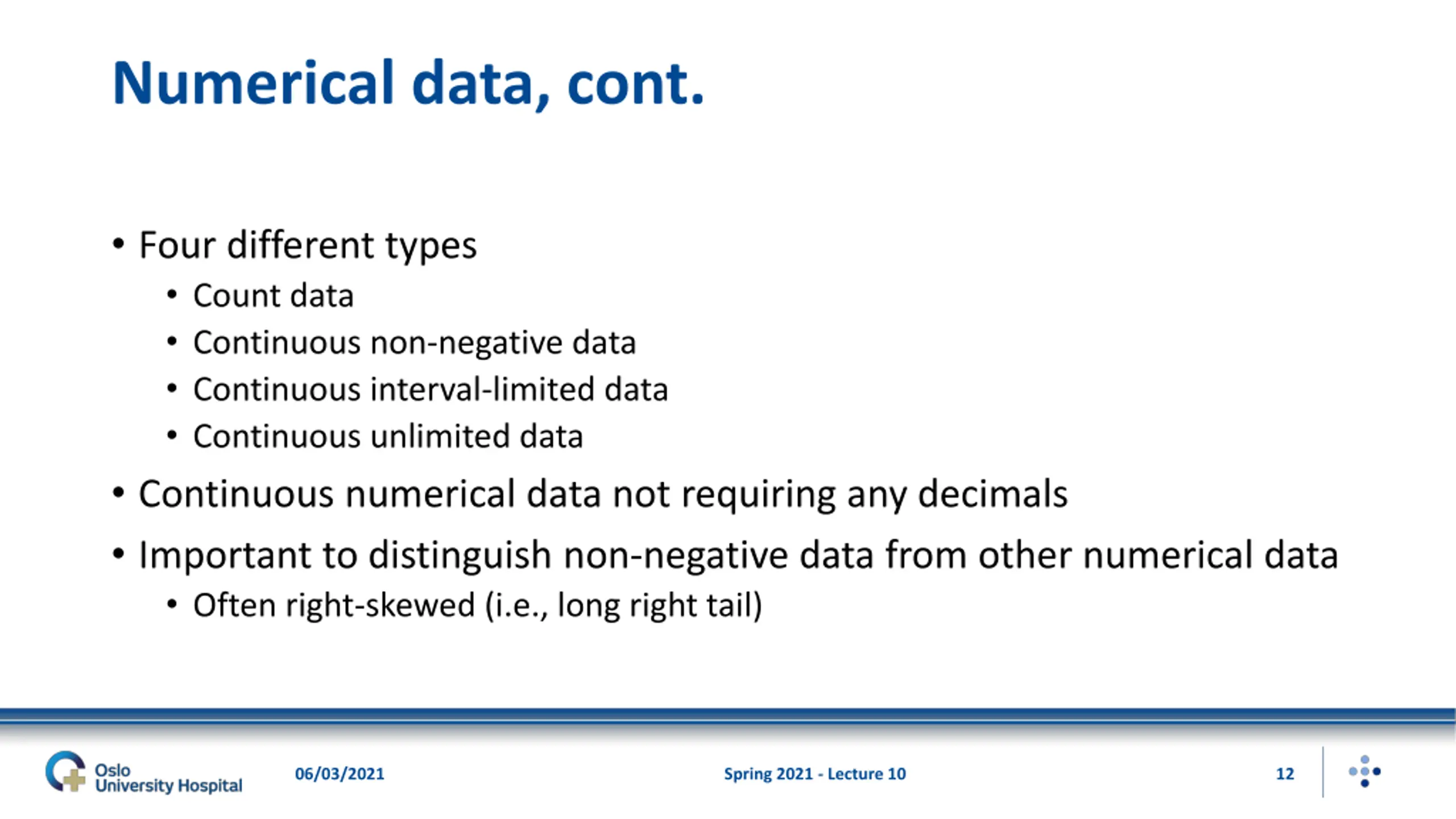 Numerical data, cont. Four different types Count data Continuous non-negative data Continuous interval-limited data Continuous unlimited data Continuous numerical data not requiring any decimals Important to distinguish non-negative data from other numerical data Often right-skewed (i.e., long right tail) 06/03/2021 Spring 2021 - Lecture 10 12