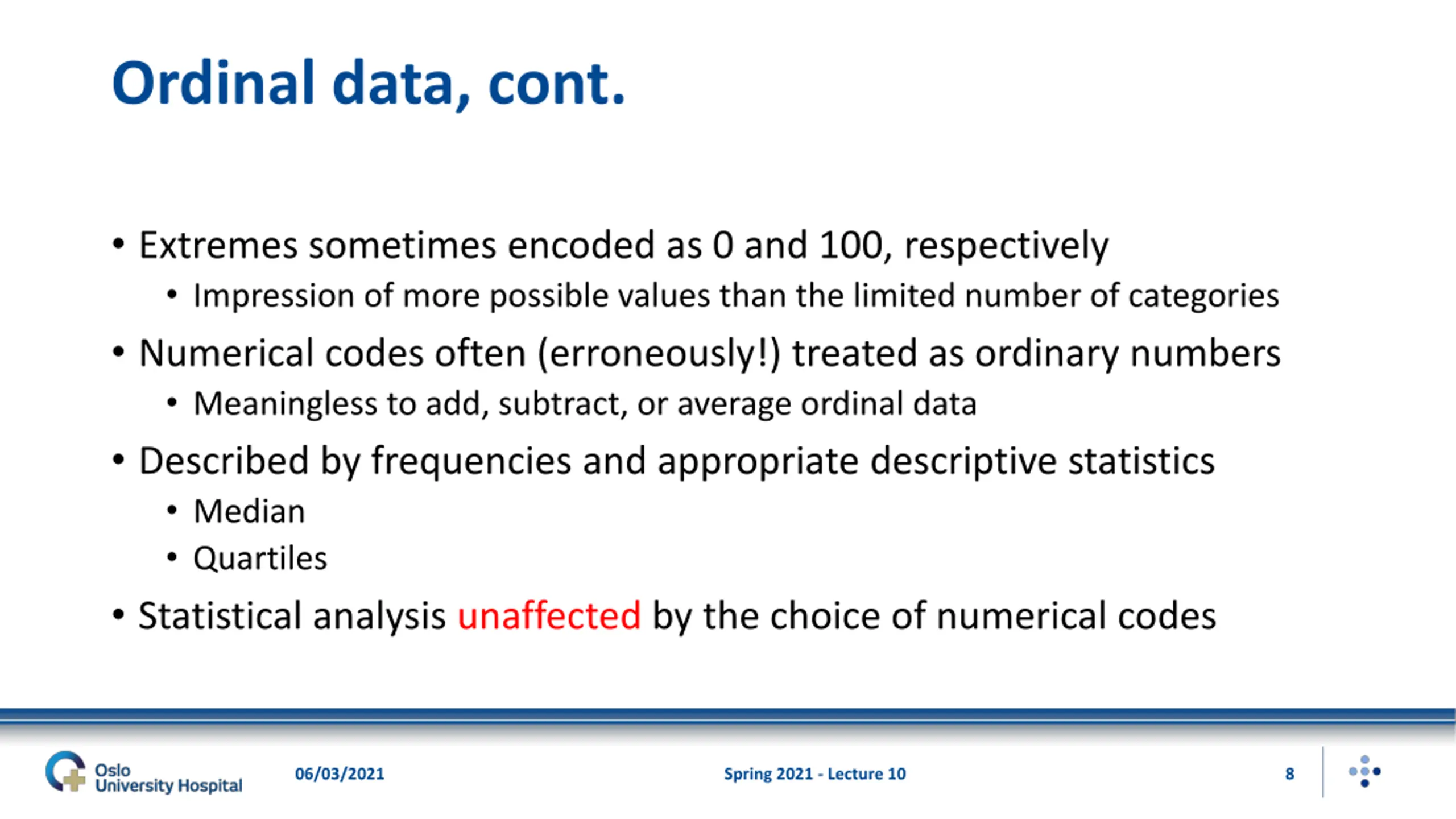 Ordinal data, cont. Extremes sometimes encoded as 0 and 100, respectively Impression of more possible values than the limited number of categories Numerical codes often (erroneously!) treated as ordinary numbers Meaningless to add, subtract, or average ordinal data Described by frequencies and appropriate descriptive statistics Median Quartiles Statistical analysis unaffected by the choice of numerical codes 06/03/2021 Spring 2021 - Lecture 10 8