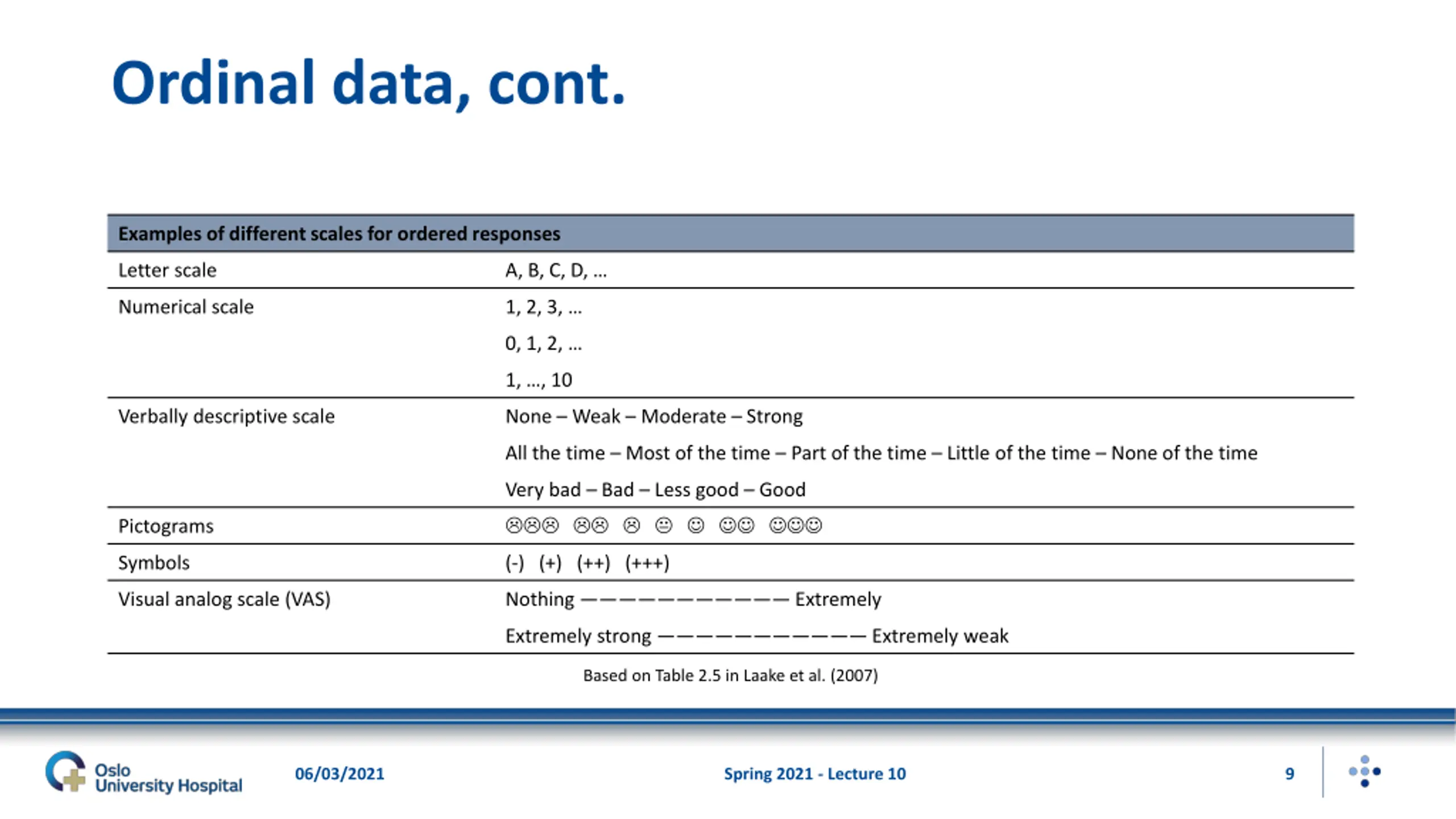 Ordinal data, cont. Examples of different scales for ordered responses Letter scale A, B, C, D, Numerical scale 1, 2, 3, 0, 1, 2, 1, , 10 Verbally descriptive scale None Weak Moderate Strong All the time Most of the time Part of the time Little of the time None of the time Very bad Bad Less good Good Pictograms Symbols (-) (+) (++) (+++) Visual analog scale (VAS) Nothing Extremely Extremely strong Extremely weak Based on Table 2.5 in Laake et al. (2007) 06/03/2021 Spring 2021 - Lecture 10 9