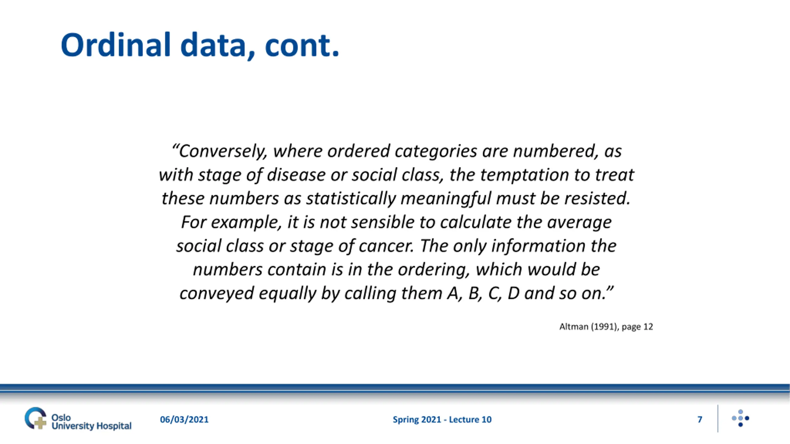 Ordinal data, cont. Conversely, where ordered categories are numbered, as with stage of disease or social class, the temptation to treat these numbers as statistically meaningful must be resisted. For example, it is not sensible to calculate the average social class or stage of cancer. The only information the numbers contain is in the ordering, which would be conveyed equally by calling them A, B, C, D and so on. Altman (1991), page 12 06/03/2021 Spring 2021 - Lecture 10 7