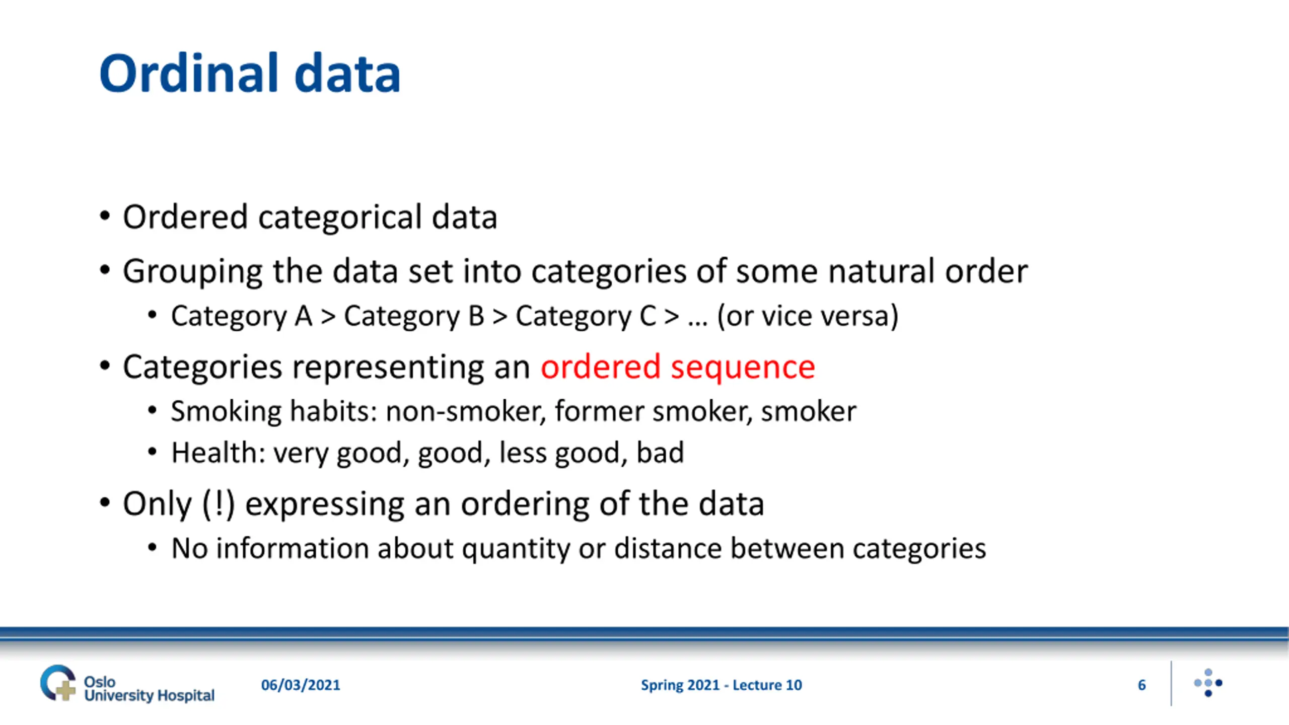Ordinal data Ordered categorical data Grouping the data set into categories of some natural order Category A > Category B > Category C > (or vice versa) Categories representing an ordered sequence Smoking habits: non-smoker, former smoker, smoker Health: very good, good, less good, bad Only (!) expressing an ordering of the data No information about quantity or distance between categories 06/03/2021 Spring 2021 - Lecture 10 6