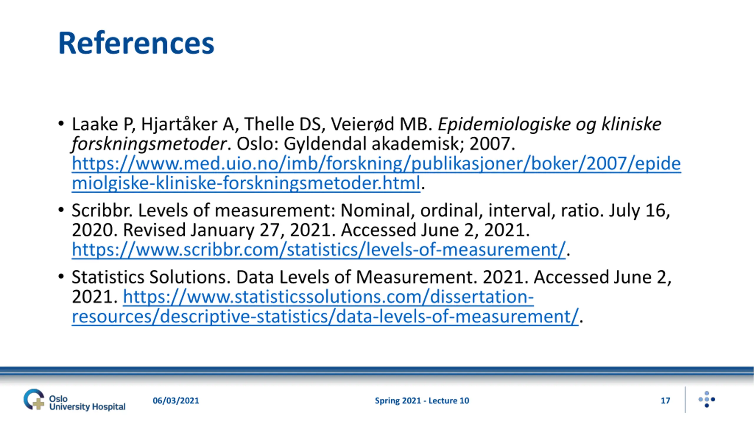 References Laake P, Hjart ker A, Thelle DS, Veier d MB. Epidemiologiske og kliniske forskningsmetoder. Oslo: Gyldendal akademisk; 2007. https://www.med.uio.no/imb/forskning/publikasjoner/boker/2007/epide miolgiske-kliniske-forskningsmetoder.html. Scribbr. Levels of measurement: Nominal, ordinal, interval, ratio. July 16, 2020. Revised January 27, 2021. Accessed June 2, 2021. https://www.scribbr.com/statistics/levels-of-measurement/. Statistics Solutions. Data Levels of Measurement. 2021. Accessed June 2, 2021. https://www.statisticssolutions.com/dissertation- resources/descriptive-statistics/data-levels-of-measurement/. 06/03/2021 Spring 2021 - Lecture 10 17