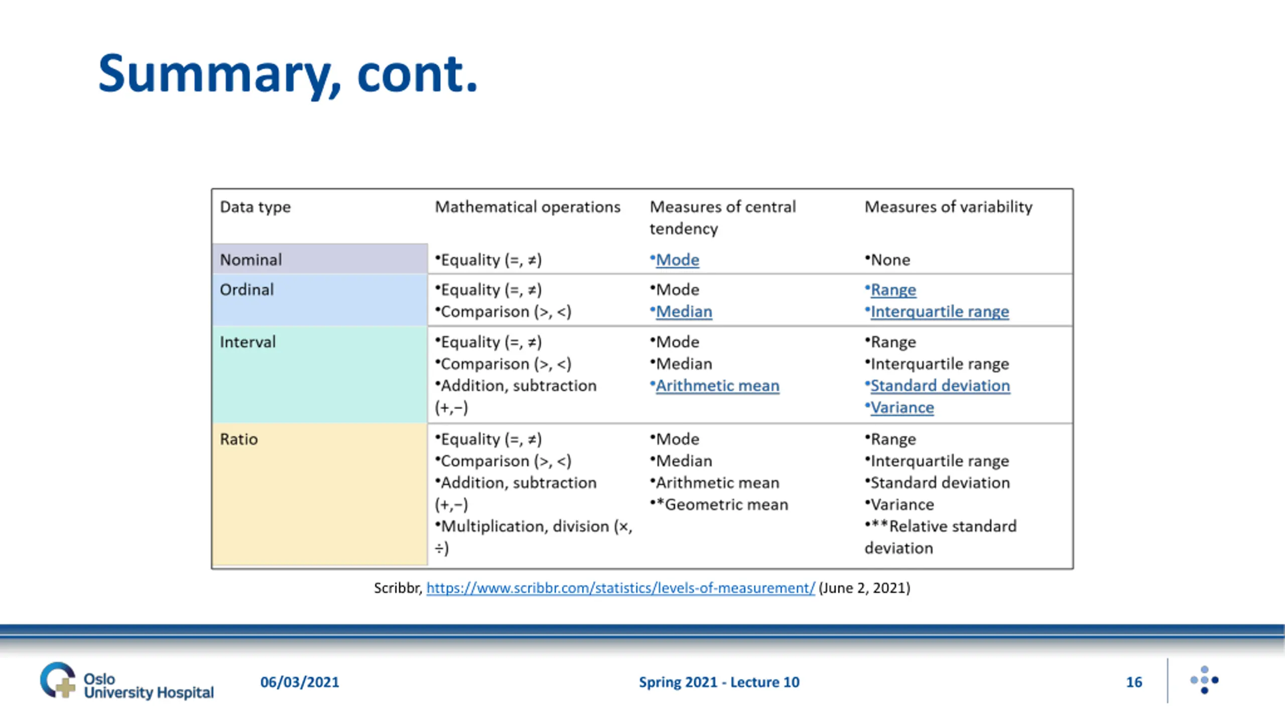 Summary, cont. Scribbr, https://www.scribbr.com/statistics/levels-of-measurement/(June 2, 2021) 06/03/2021 Spring 2021 - Lecture 10 16