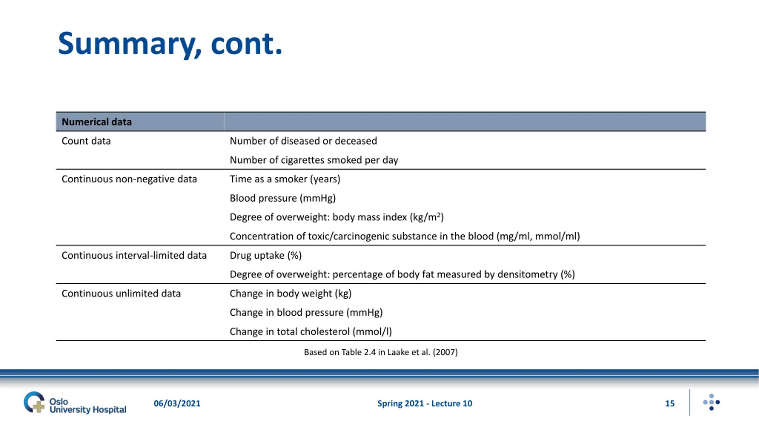 Summary Categorical data Dichotomous data Exposure: exposed, unexposed Obesity: obese, non-obese Smoking habits: smoker vs. non-smoker Sex: male, female Nominal data Type of strenuous work (heavy lifting, monotone working posture, etc.) Name of toxic/carcinogenic substance of exposure Ordinal data Smoking habits: non-smoker, former smoker, smoker Blood pressure: low, normal, high Degree of overweight: moderate, high, very high Pain: 0, 1, 2, 3, 4 Perceived health: very good, good, less good, bad Based on Table 2.4 in Laake et al. (2007) 06/03/2021 Spring 2021 - Lecture 10 14