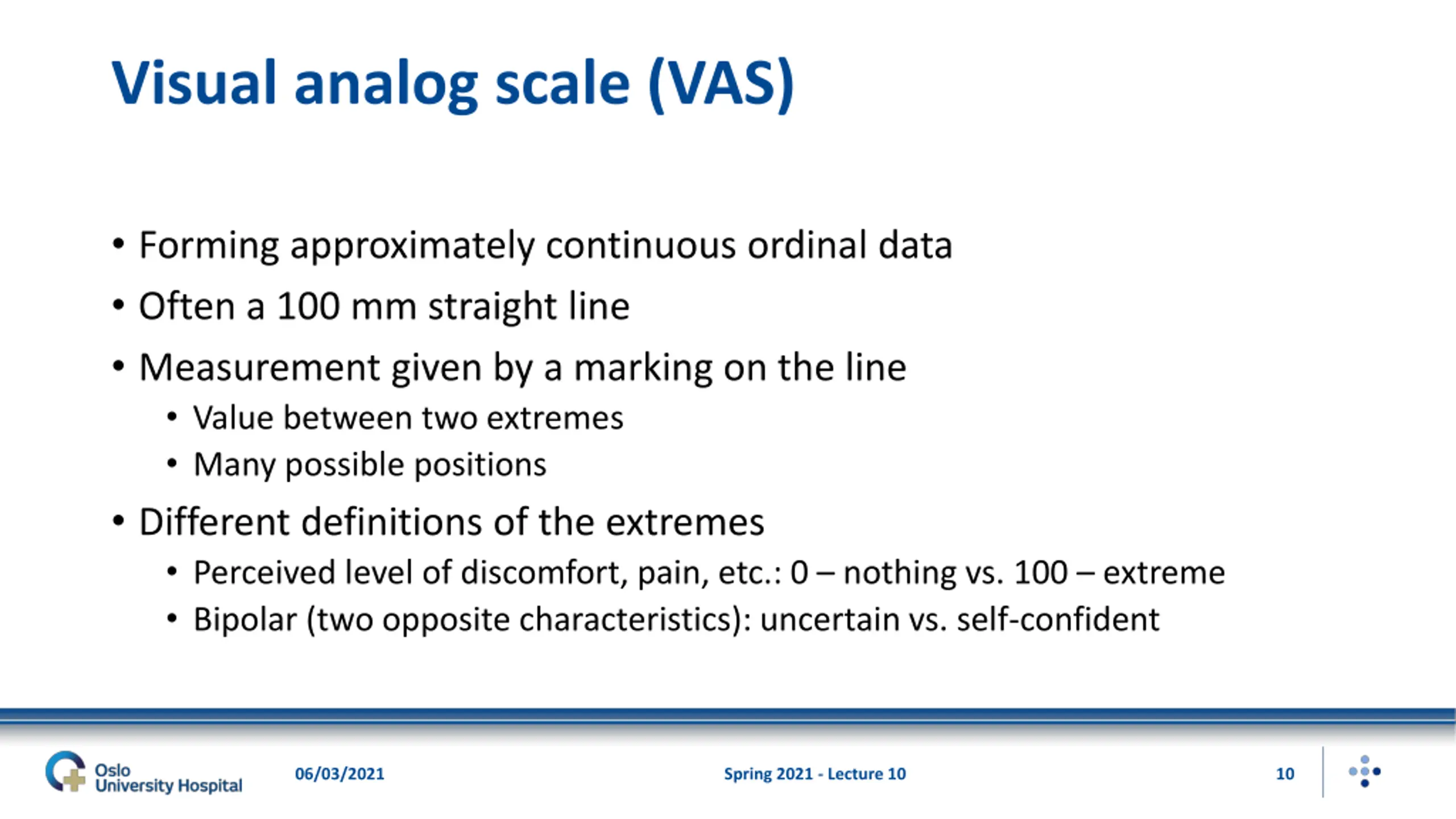 Visual analog scale (VAS) Forming approximately continuous ordinal data Often a 100 mm straight line Measurement given by a marking on the line Value between two extremes Many possible positions Different definitions of the extremes Perceived level of discomfort, pain, etc.: 0 nothing vs. 100 extreme Bipolar (two opposite characteristics): uncertain vs. self-confident 06/03/2021 Spring 2021 - Lecture 10 10