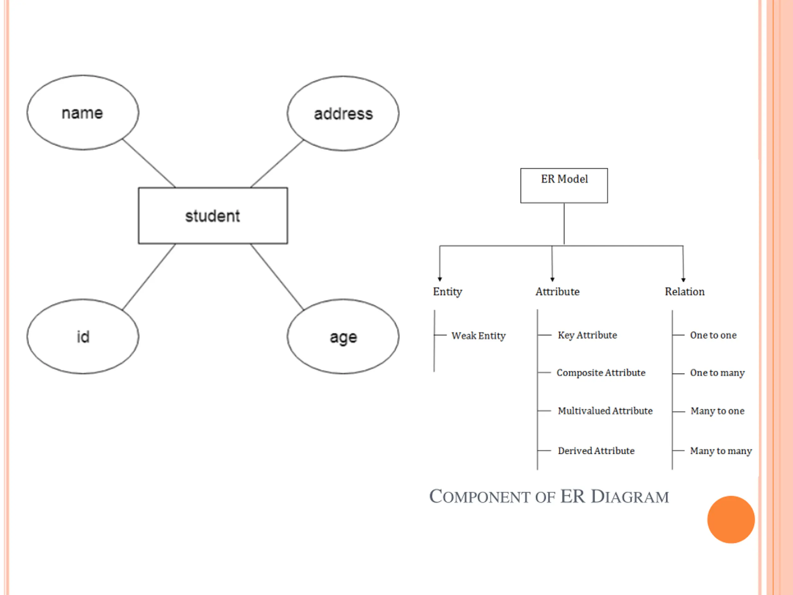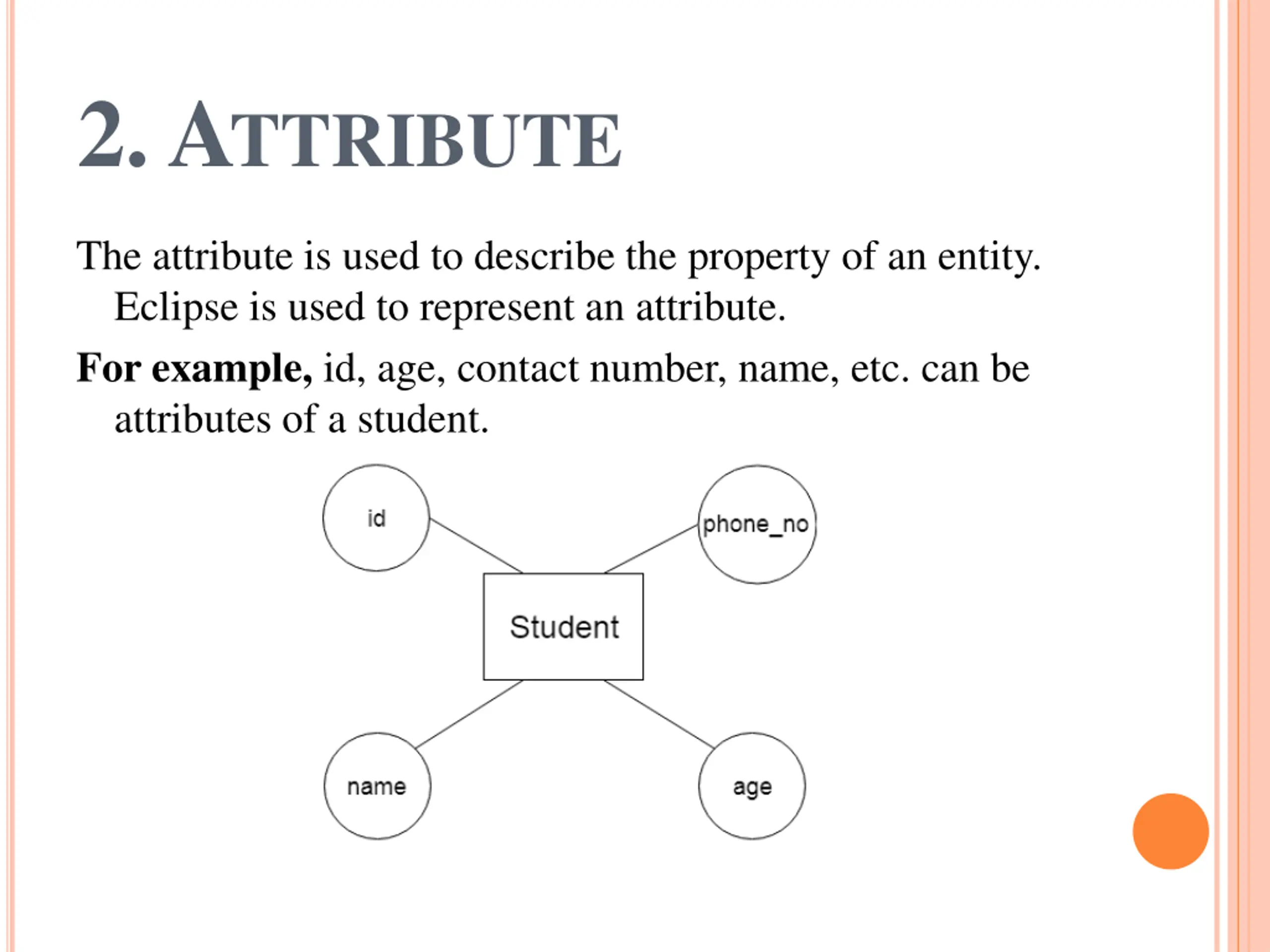 2. ATTRIBUTE The attribute is used to describe the property of an entity. Eclipse is used to represent an attribute. For example, id, age, contact number, name, etc. can be attributes of a student.