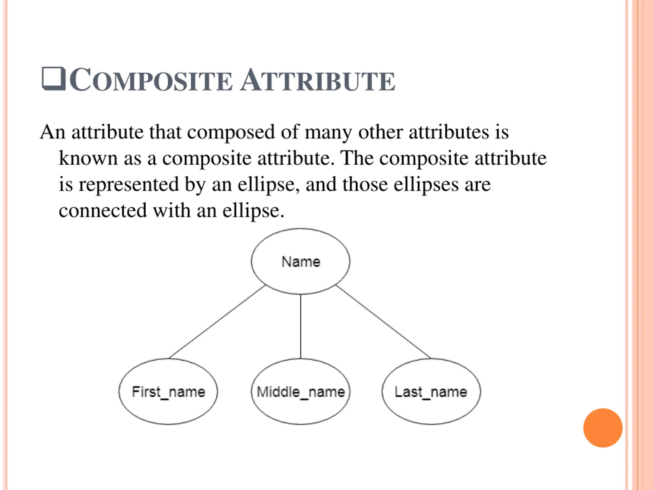 COMPOSITEATTRIBUTE An attribute that composed of many other attributes is known as a composite attribute. The composite attribute is represented by an ellipse, and those ellipses are connected with an ellipse.