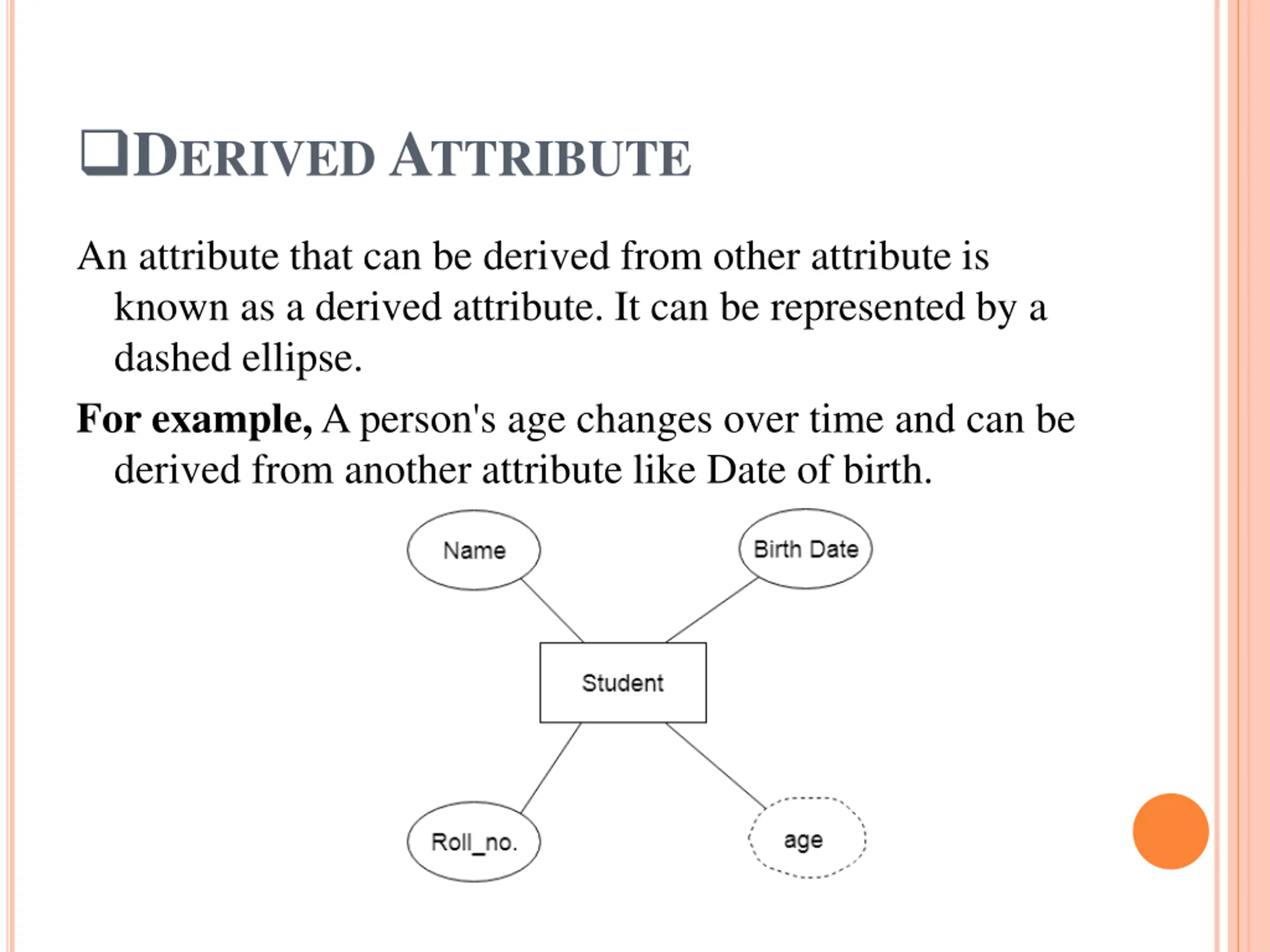 DERIVEDATTRIBUTE An attribute that can be derived from other attribute is known as a derived attribute. It can be represented by a dashed ellipse. For example,A person's age changes over time and can be derived from another attribute like Date of birth.
