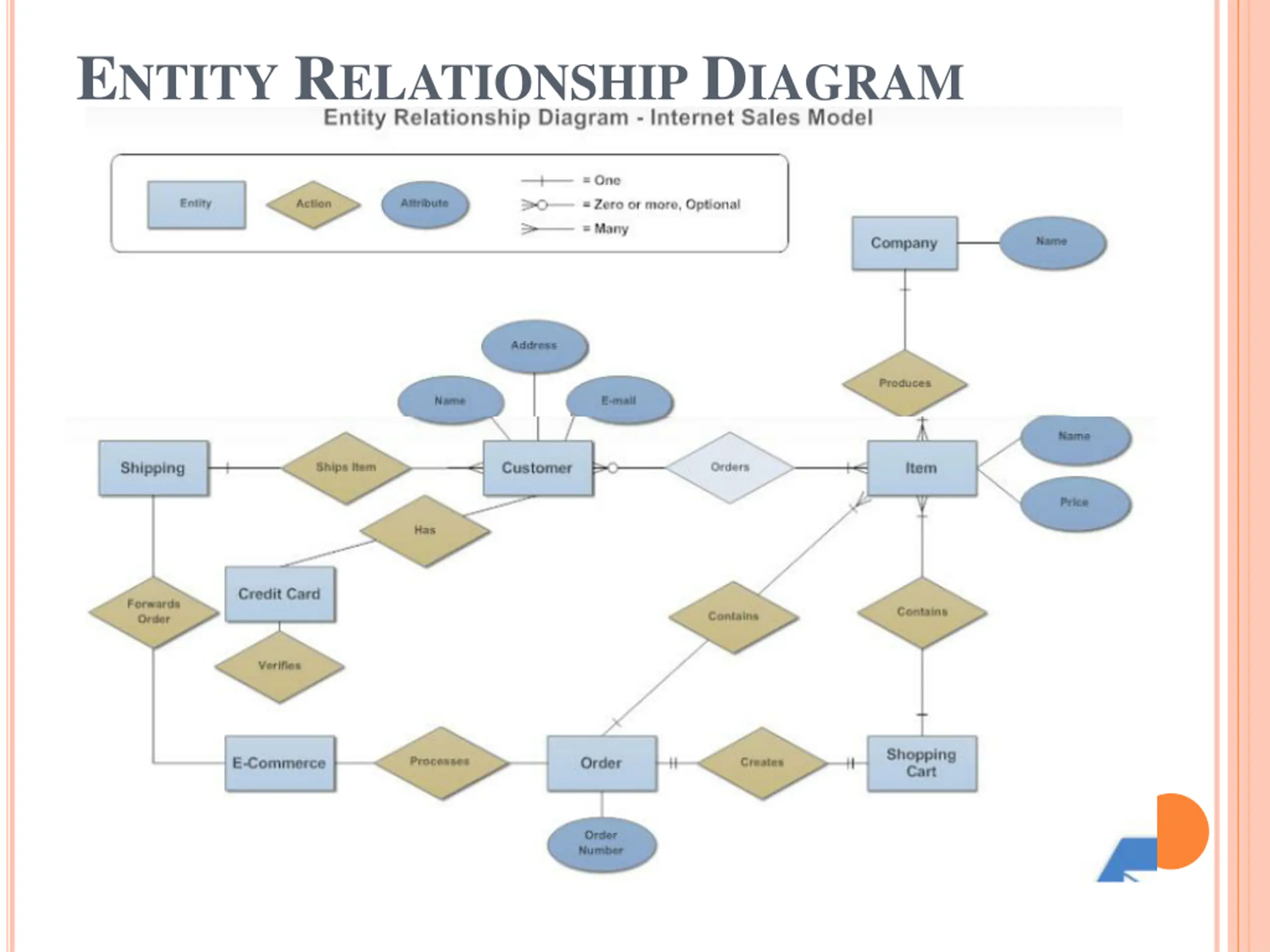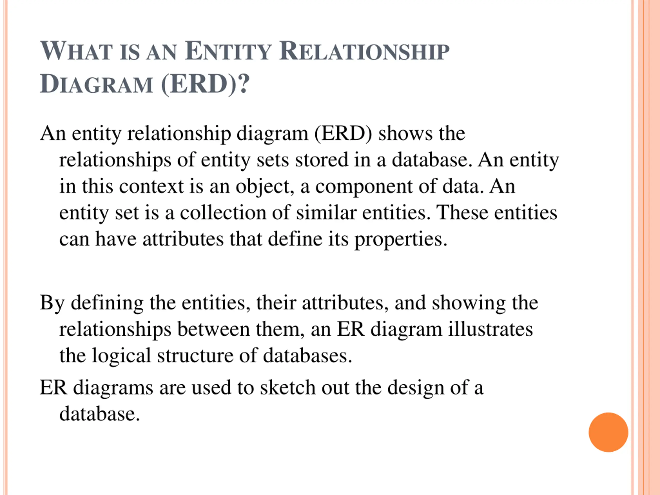 WHAT IS AN ENTITY RELATIONSHIP DIAGRAM (ERD)? An entity relationship diagram (ERD) shows the relationships of entity sets stored in a database. An entity in this context is an object, a component of data. An entity set is a collection of similar entities. These entities can have attributes that define its properties. By defining the entities, their attributes, and showing the relationships between them, an ER diagram illustrates the logical structure of databases. ER diagrams are used to sketch out the design of a database.
