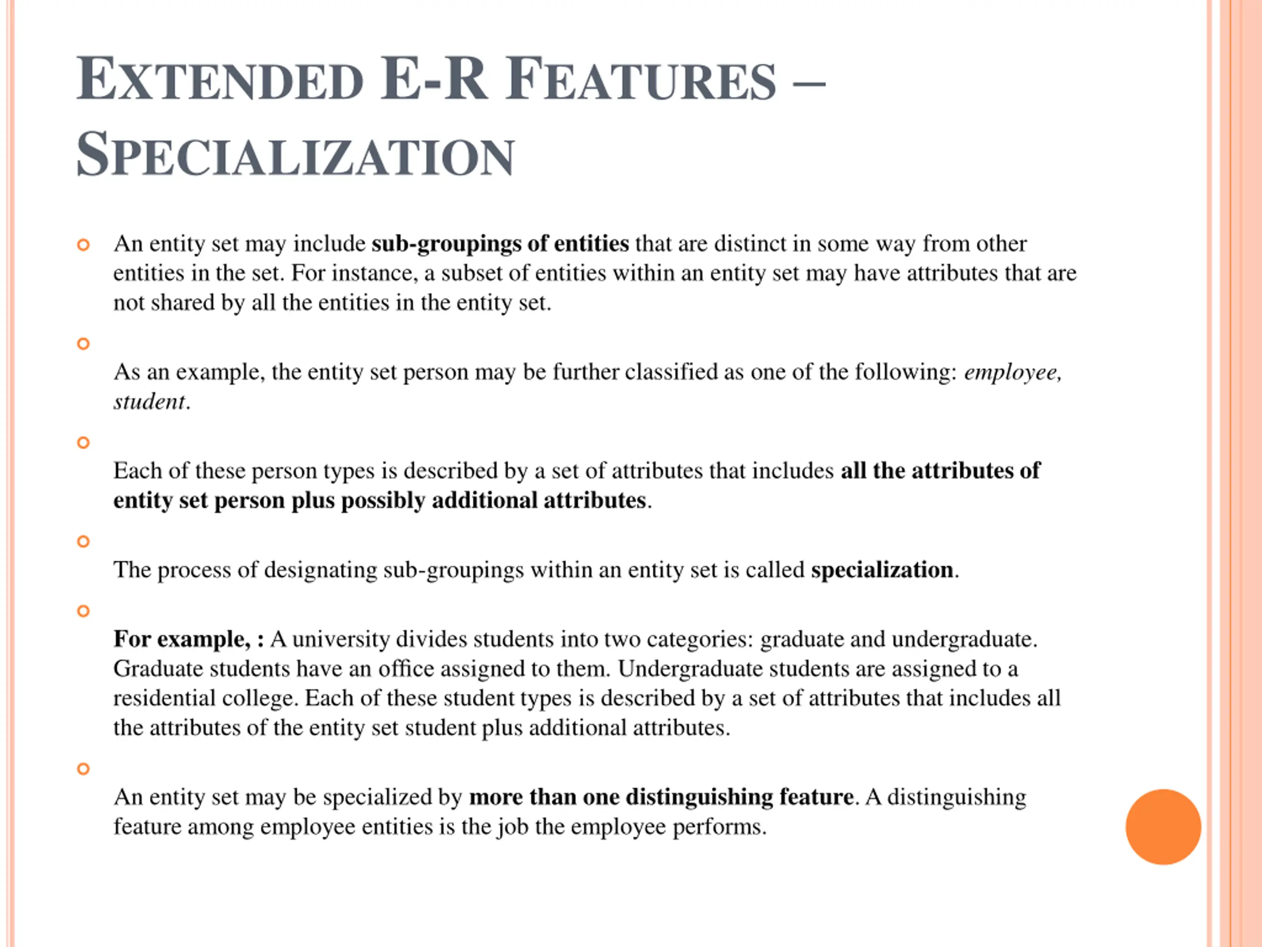 EXTENDED E-R FEATURES SPECIALIZATION An entity set may include sub-groupings of entities that are distinct in some way from other entities in the set. For instance, a subset of entities within an entity set may have attributes that are not shared by all the entities in the entity set. As an example, the entity set person may be further classified as one of the following: employee, student. Each of these person types is described by a set of attributes that includes all the attributes of entity set person plus possibly additional attributes. The process of designating sub-groupings within an entity set is called specialization. For example, :A university divides students into two categories: graduate and undergraduate. Graduate students have an office assigned to them. Undergraduate students are assigned to a residential college. Each of these student types is described by a set of attributes that includes all the attributes of the entity set student plus additional attributes. An entity set may be specialized by more than one distinguishing feature. A distinguishing feature among employee entities is the job the employee performs.