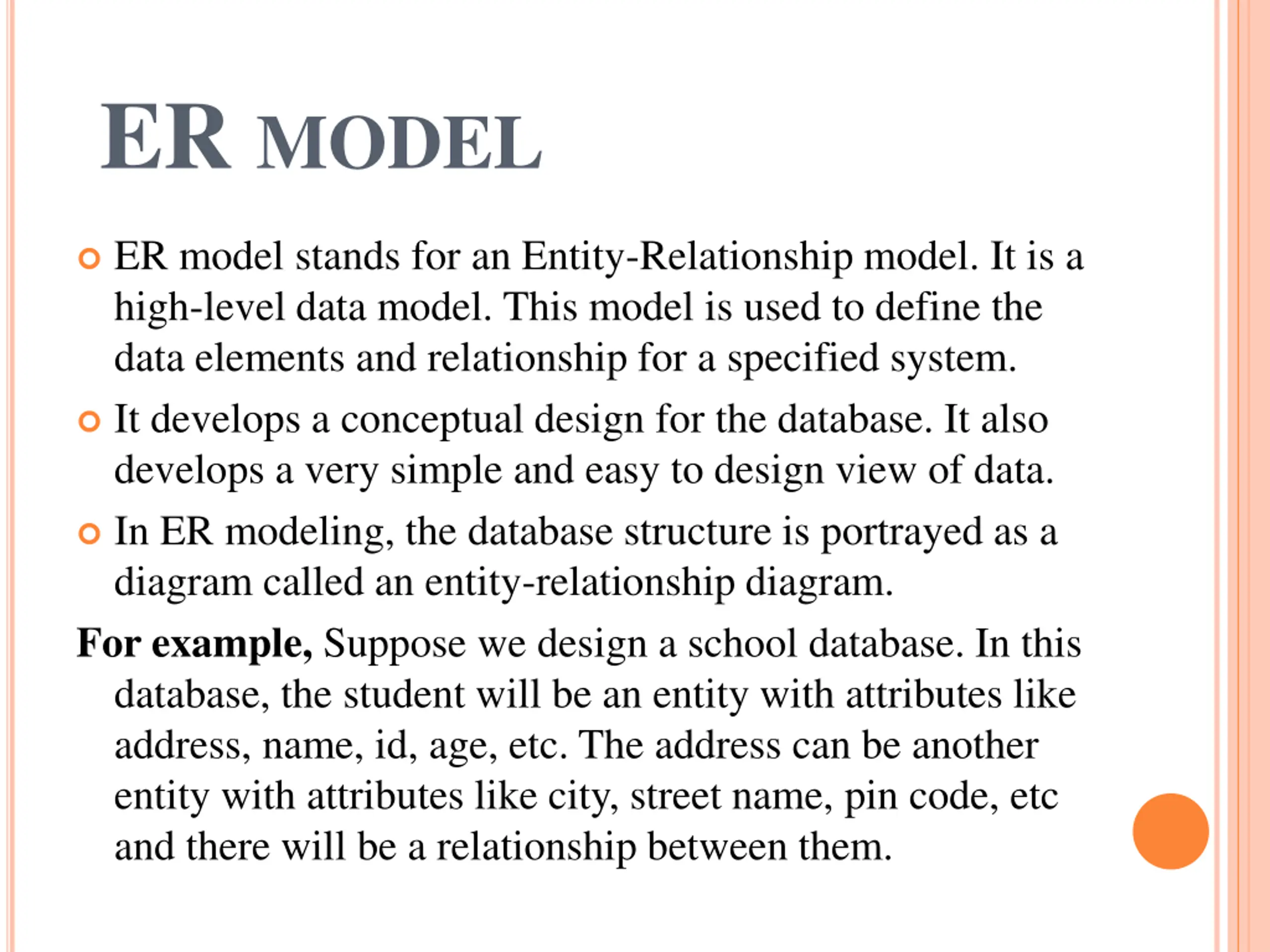 ER MODEL ER model stands for an Entity-Relationship model. It is a high-level data model. This model is used to define the data elements and relationship for a specified system. It develops a conceptual design for the database. It also develops a very simple and easy to design view of data. In ER modeling, the database structure is portrayed as a diagram called an entity-relationship diagram. For example, Suppose we design a school database. In this database, the student will be an entity with attributes like address, name, id, age, etc. The address can be another entity with attributes like city, street name, pin code, etc and there will be a relationship between them.