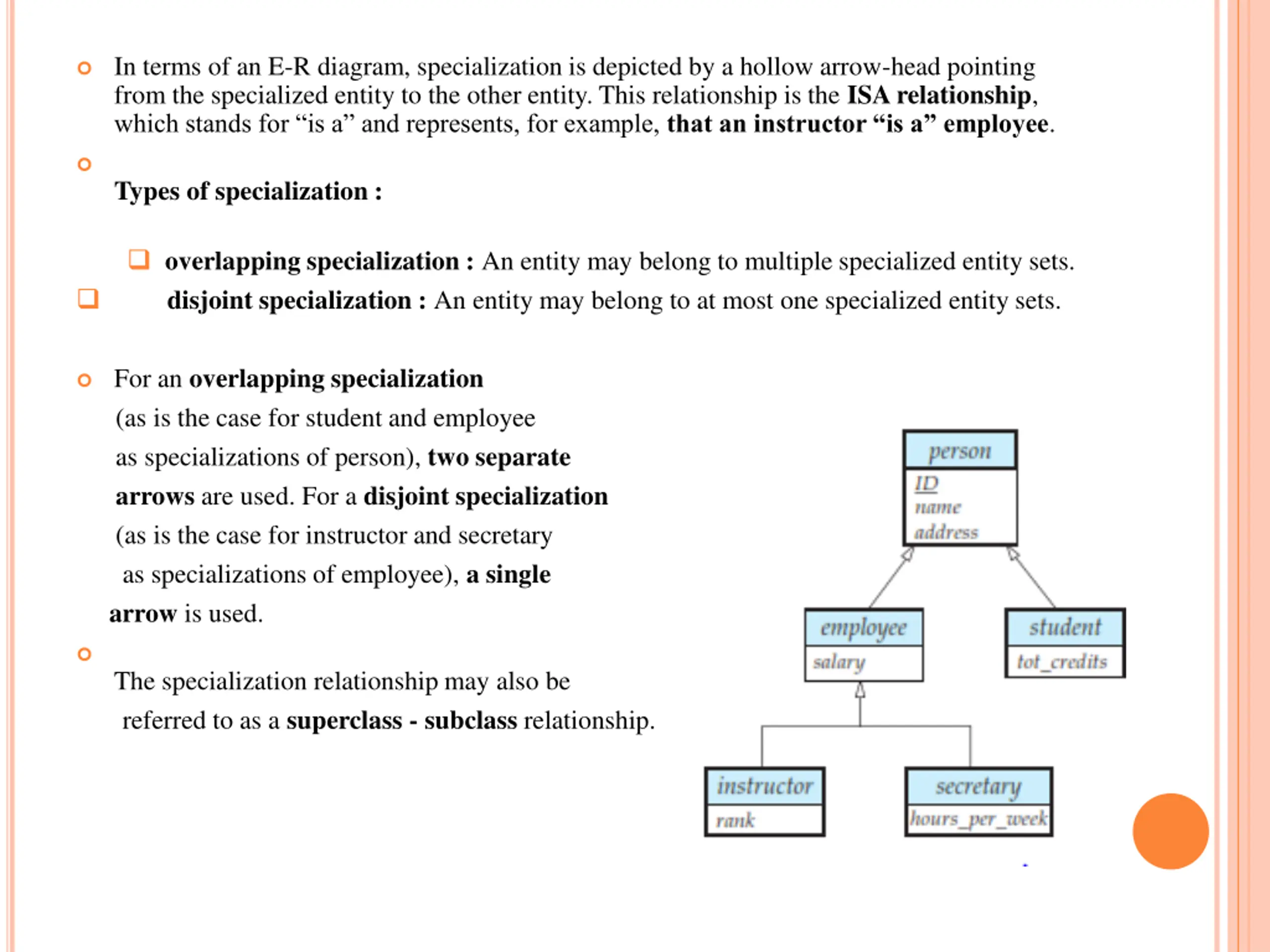 In terms of an E-R diagram, specialization is depicted by a hollow arrow-head pointing from the specialized entity to the other entity. This relationship is the ISA relationship, which stands for is a and represents, for example, that an instructor is a employee. Types of specialization : overlapping specialization : An entity may belong to multiple specialized entity sets. disjoint specialization : An entity may belong to at most one specialized entity sets. For an overlapping specialization (as is the case for student and employee as specializations of person), two separate arrows are used. For a disjoint specialization (as is the case for instructor and secretary as specializations of employee), a single arrow is used. The specialization relationship may also be referred to as a superclass - subclass relationship.