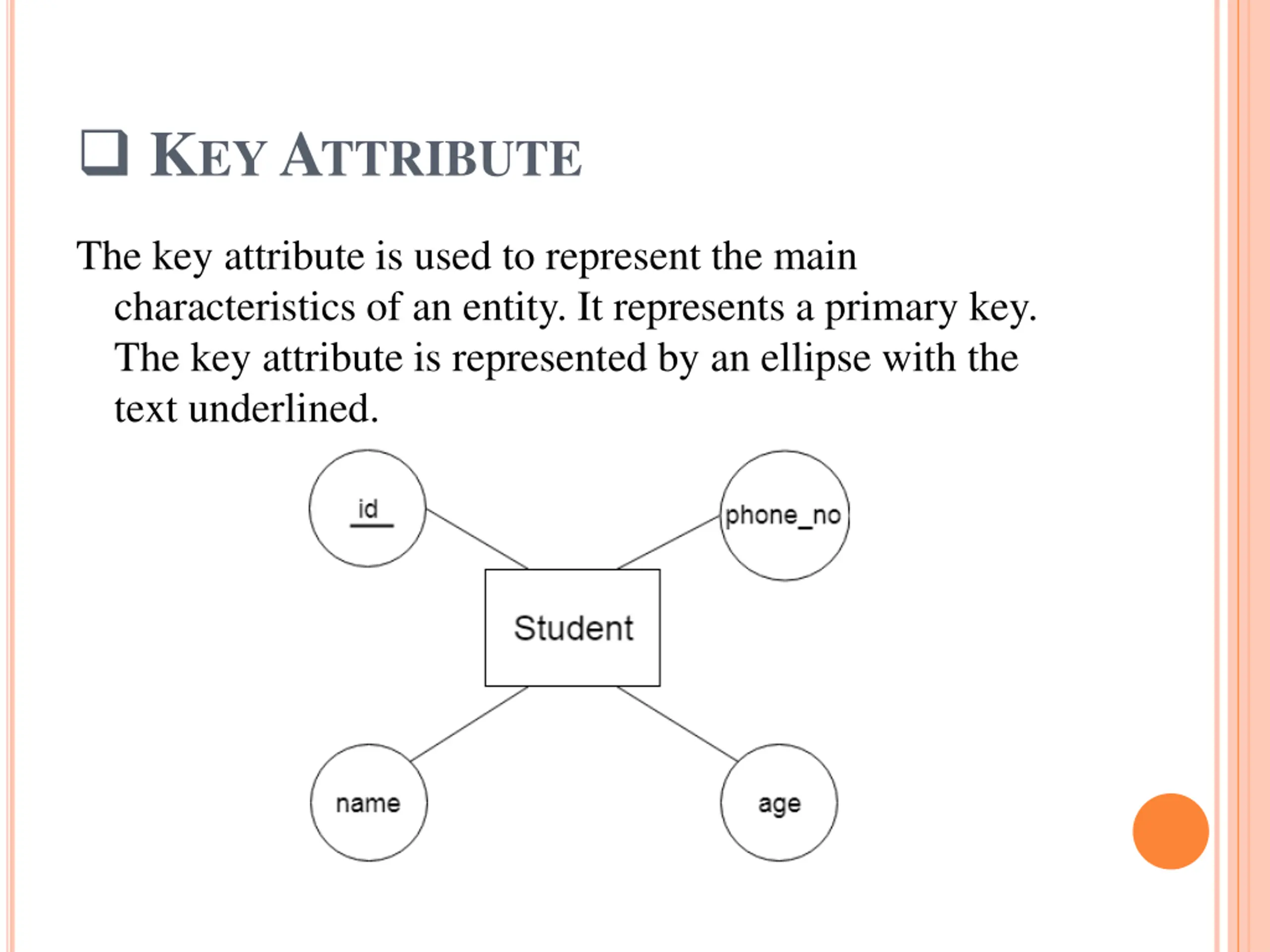 KEYATTRIBUTE The key attribute is used to represent the main characteristics of an entity. It represents a primary key. The key attribute is represented by an ellipse with the text underlined.