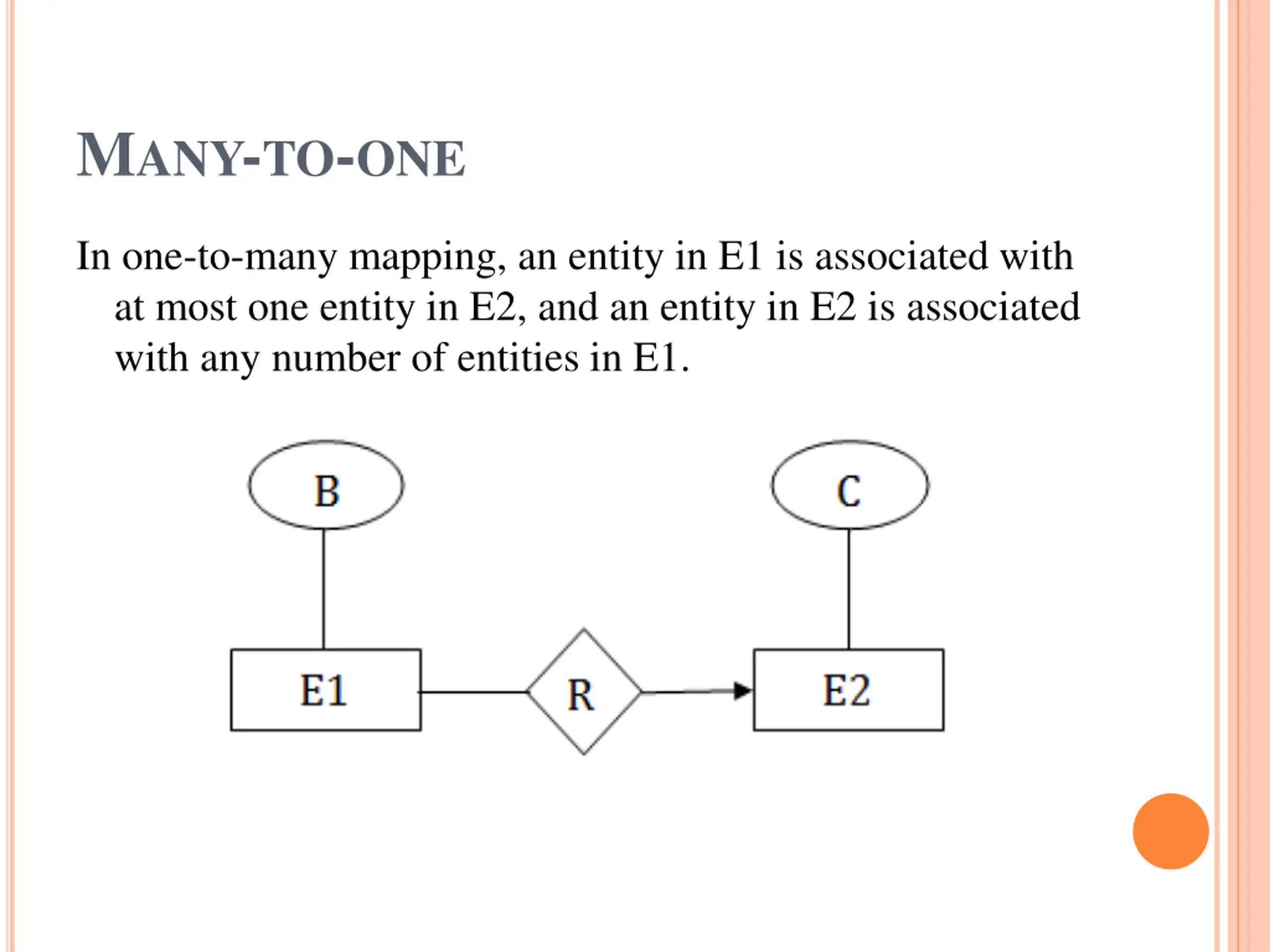 MANY-TO-ONE In one-to-many mapping, an entity in E1 is associated with at most one entity in E2, and an entity in E2 is associated with any number of entities in E1.