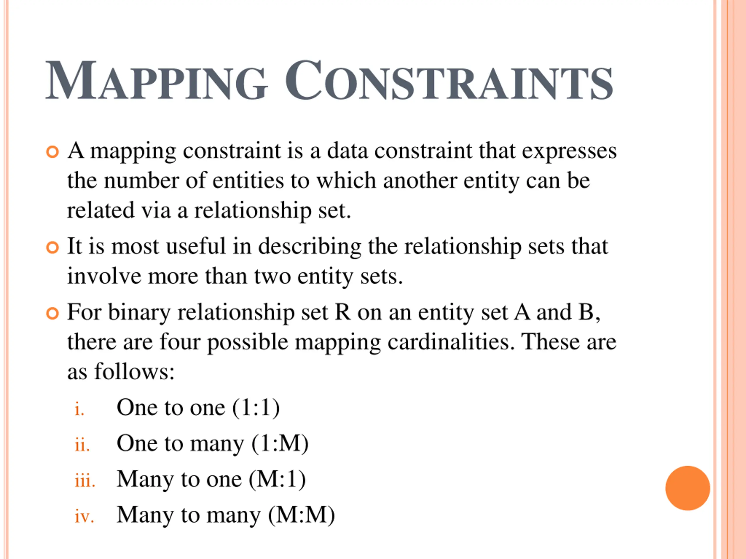 MAPPING CONSTRAINTS A mapping constraint is a data constraint that expresses the number of entities to which another entity can be related via a relationship set. It is most useful in describing the relationship sets that involve more than two entity sets. For binary relationship set R on an entity set A and B, there are four possible mapping cardinalities. These are as follows: One to one (1:1) One to many (1:M) iii. Many to one (M:1) iv. Many to many (M:M) i. ii.