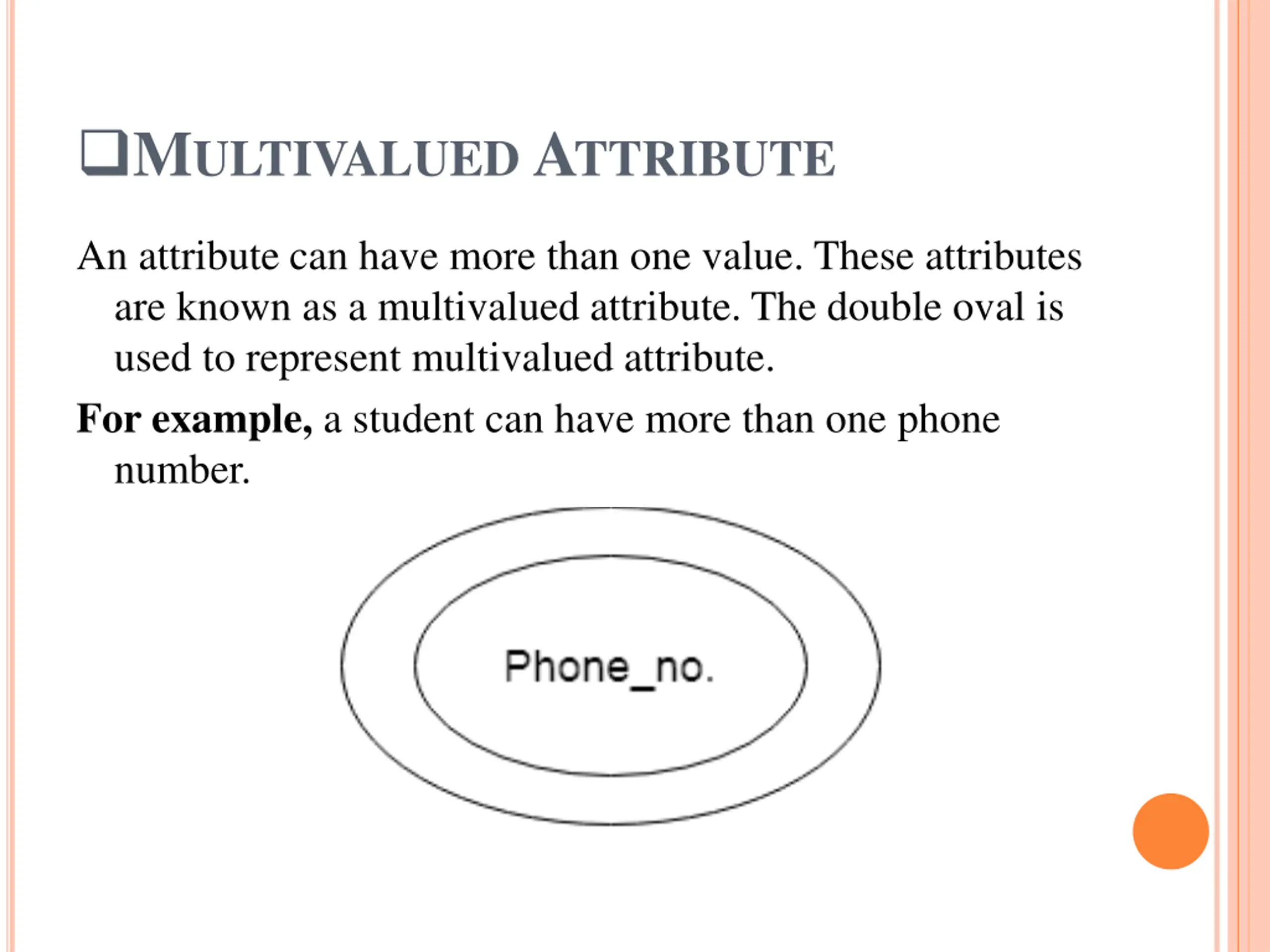 MULTIVALUED ATTRIBUTE An attribute can have more than one value. These attributes are known as a multivalued attribute. The double oval is used to represent multivalued attribute. For example, a student can have more than one phone number.