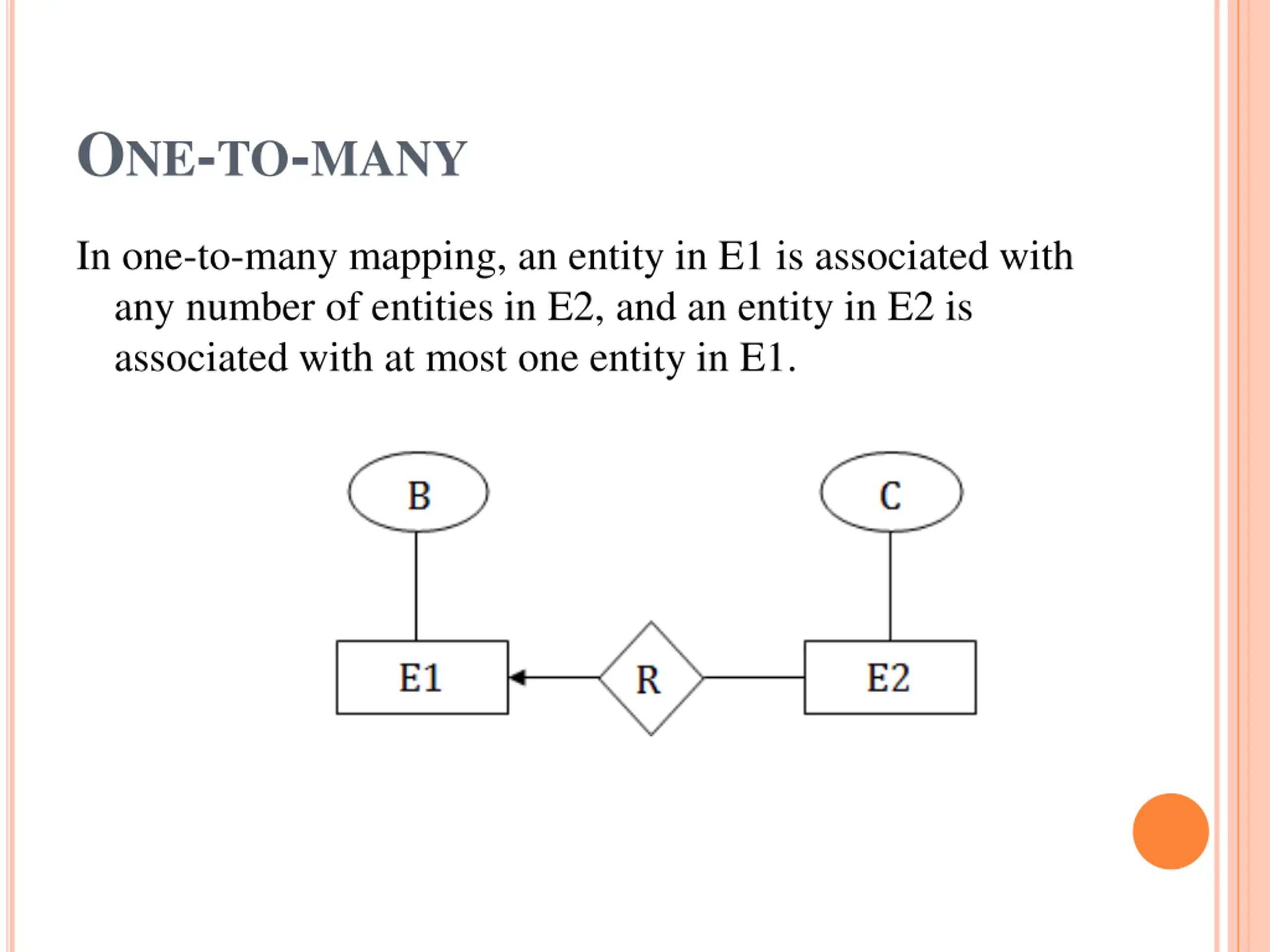 ONE-TO-MANY In one-to-many mapping, an entity in E1 is associated with any number of entities in E2, and an entity in E2 is associated with at most one entity in E1.
