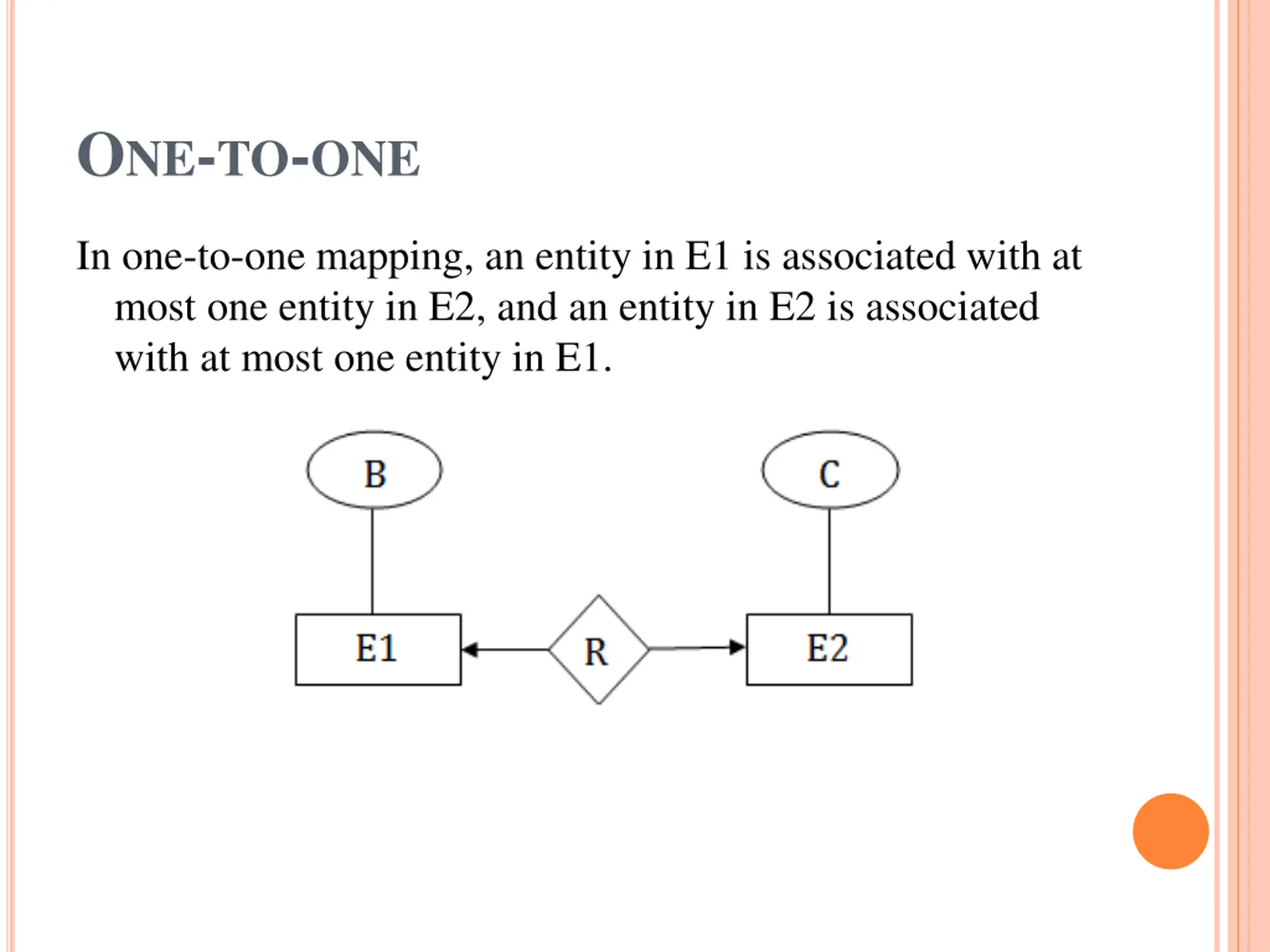 ONE-TO-ONE In one-to-one mapping, an entity in E1 is associated with at most one entity in E2, and an entity in E2 is associated with at most one entity in E1.