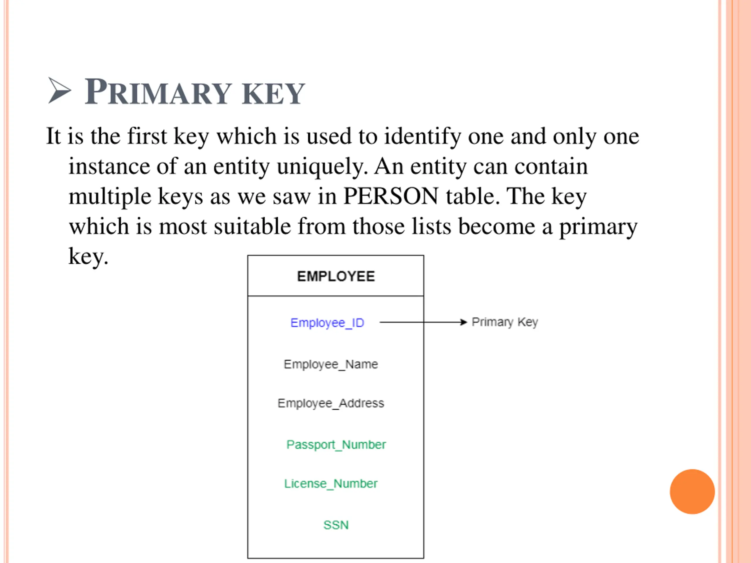 PRIMARY KEY It is the first key which is used to identify one and only one instance of an entity uniquely. An entity can contain multiple keys as we saw in PERSON table. The key which is most suitable from those lists become a primary key.
