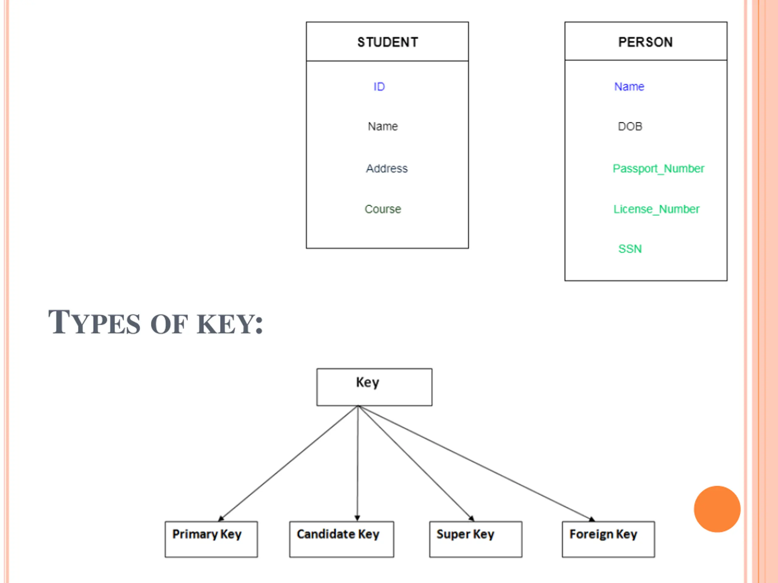 KEYS Keys play an important role in the relational database. It is used to uniquely identify any record or row of data from the table. It is also used to establish and identify relationships between tables. For example: In Student table, ID is used as a key because it is unique for each student. In PERSON table, passport_number, license_number, SSN are keys since they are unique for each person.