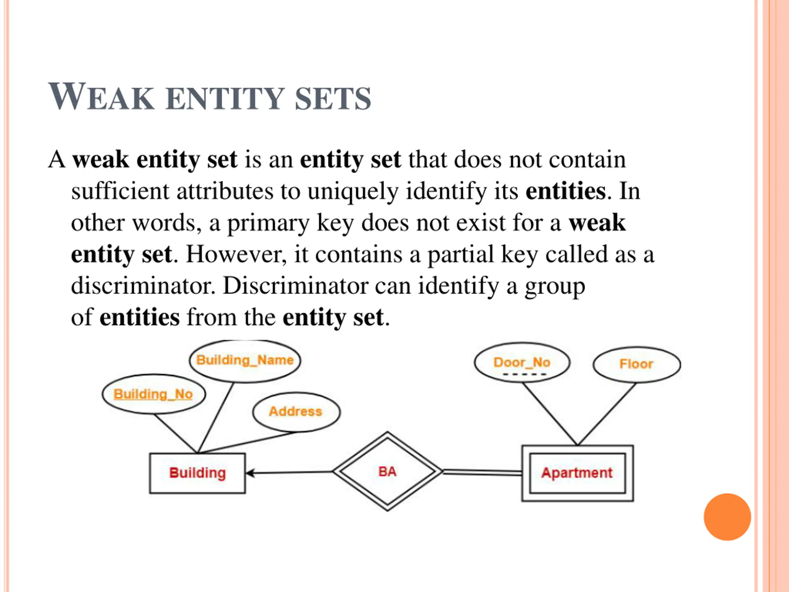 WEAK ENTITY SETS Aweak entity set is an entity set that does not contain sufficient attributes to uniquely identify its entities. In other words, a primary key does not exist for a weak entity set. However, it contains a partial key called as a discriminator. Discriminator can identify a group of entities from the entity set.