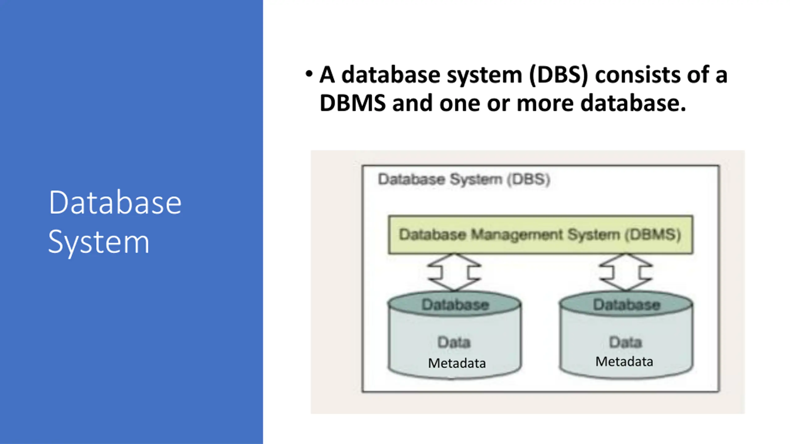 A database system (DBS) consists of a DBMS and one or more database. Database System Metadata Metadata