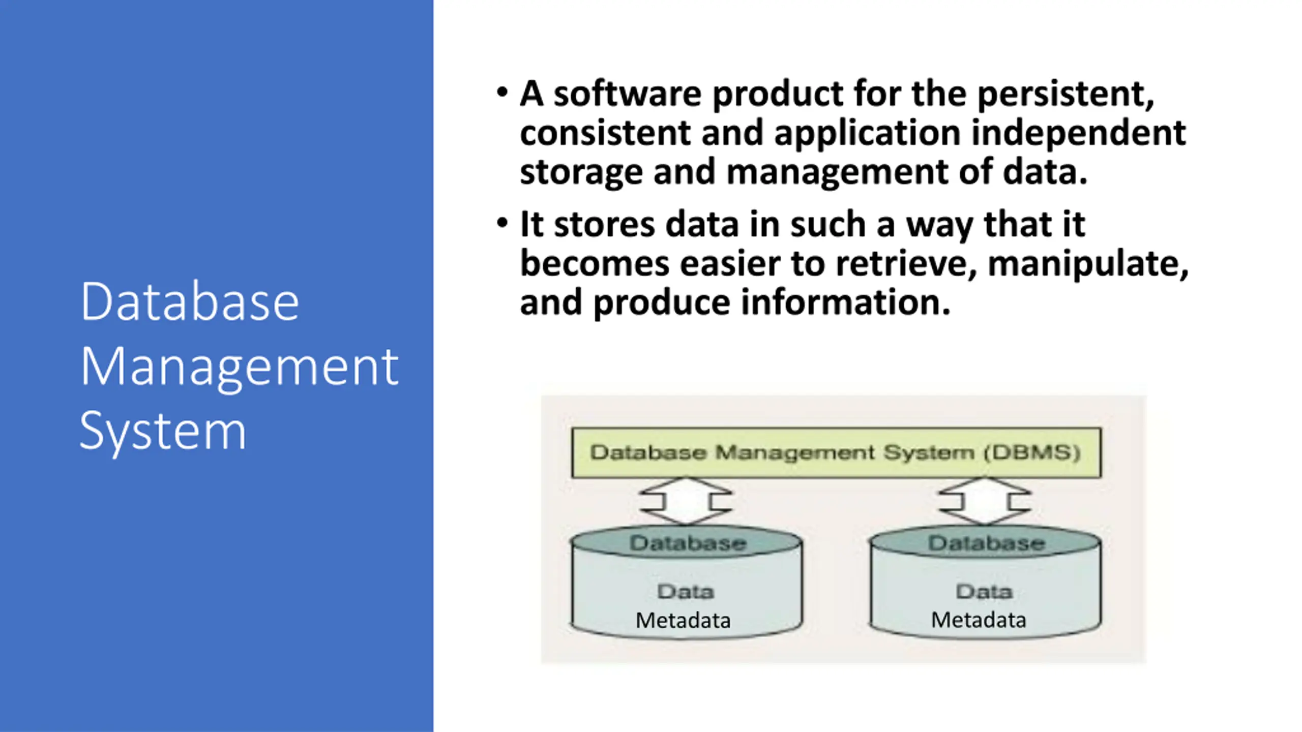 A software product for the persistent, consistent and application independent storage and management of data. It stores data in such a way that it becomes easier to retrieve, manipulate, and produce information. Database Management System Metadata Metadata