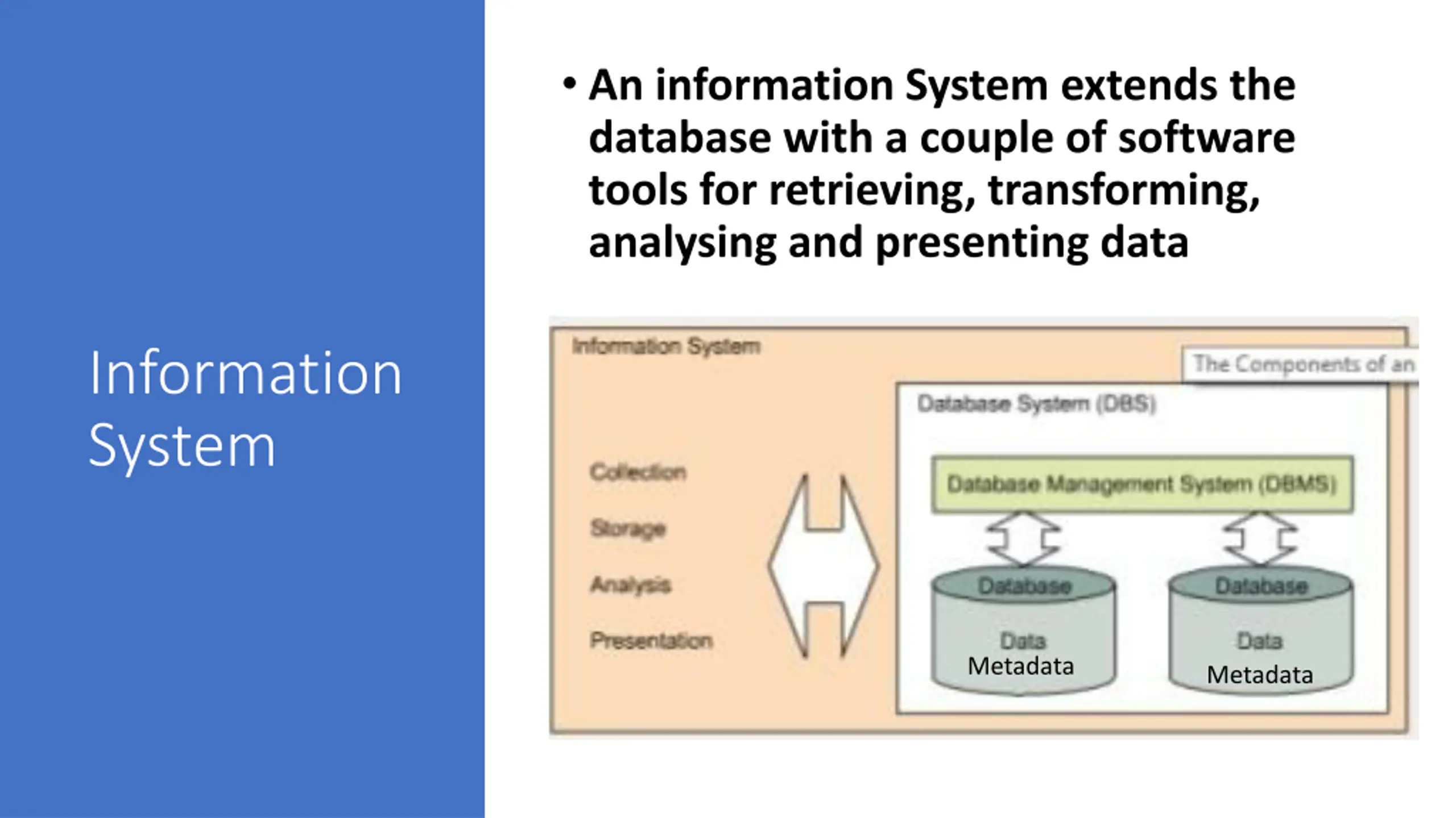 An information System extends the database with a couple of software tools for retrieving, transforming, analysing and presenting data Information System Metadata Metadata
