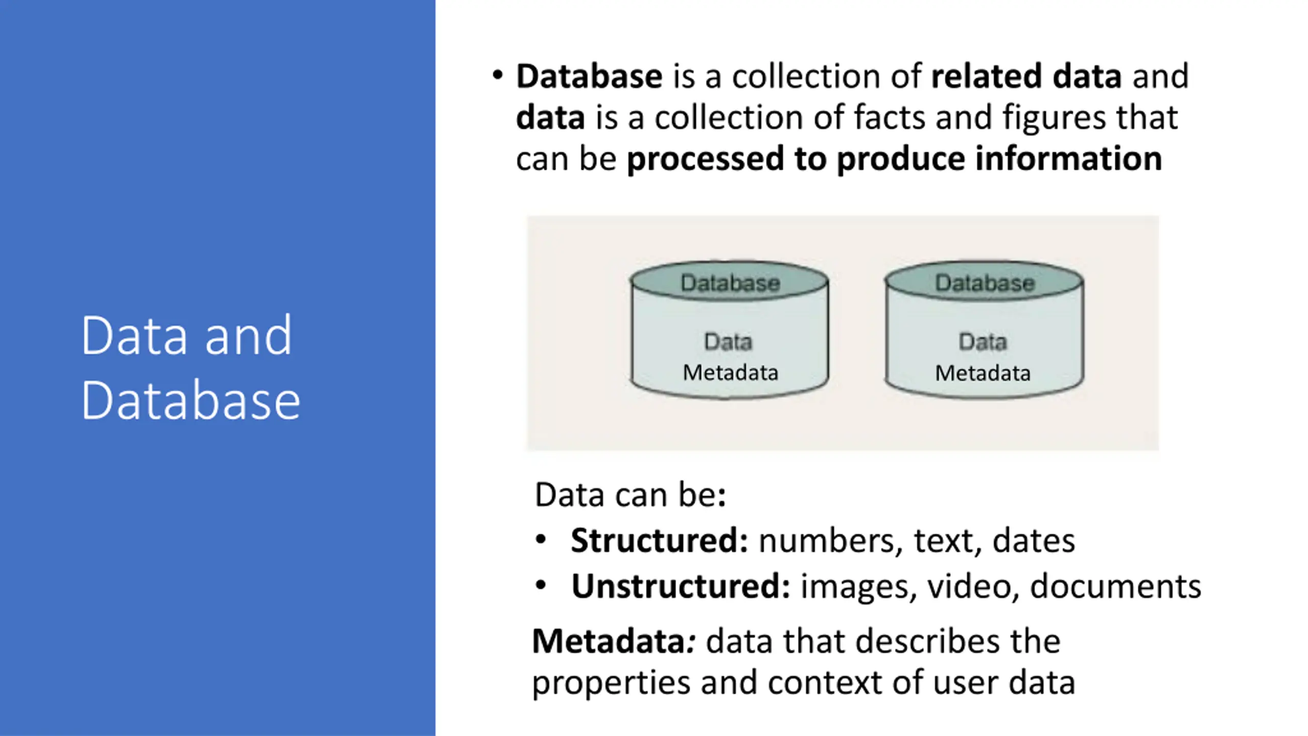 Database is a collection of related data and data is a collection of facts and figures that can be processed to produce information Data and Database Metadata Metadata Data can be: Structured: numbers, text, dates Unstructured: images, video, documents Metadata: data that describes the properties and context of user data
