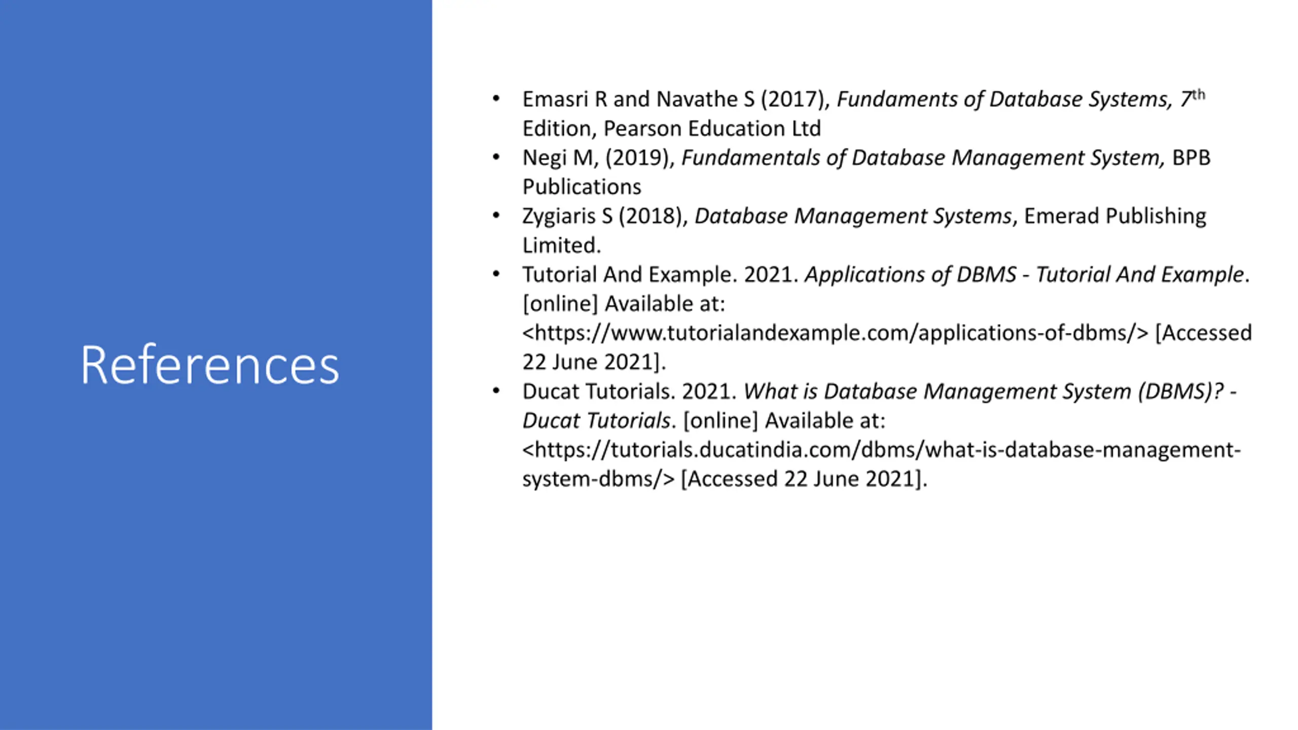 Emasri R and Navathe S (2017), Fundaments of Database Systems, 7th Edition, Pearson Education Ltd Negi M, (2019), Fundamentals of Database Management System, BPB Publications Zygiaris S (2018), Database Management Systems, Emerad Publishing Limited. Tutorial And Example. 2021. Applications of DBMS - Tutorial And Example. [online] Available at: <https://www.tutorialandexample.com/applications-of-dbms/> [Accessed 22 June 2021]. Ducat Tutorials. 2021. What is Database Management System (DBMS)? - Ducat Tutorials. [online] Available at: <https://tutorials.ducatindia.com/dbms/what-is-database-management- system-dbms/> [Accessed 22 June 2021]. References