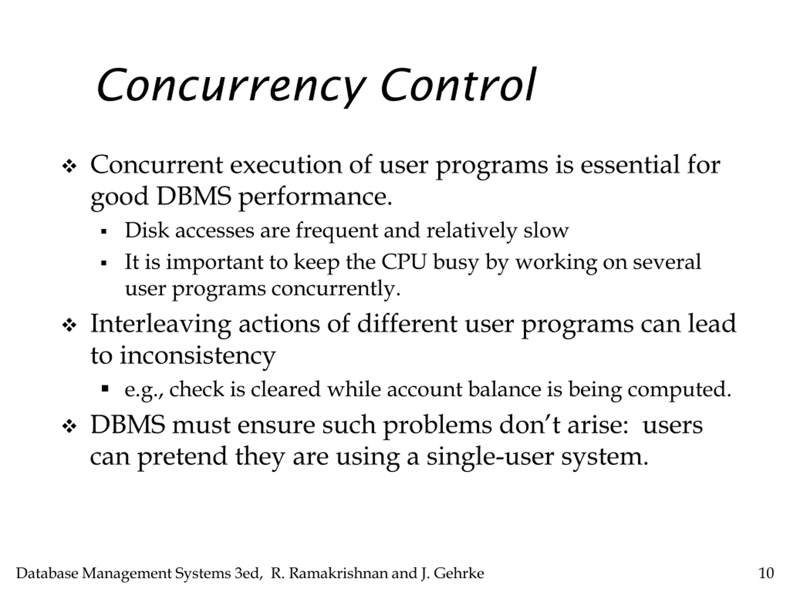 Concurrency Control Concurrent execution of user programs is essential for good DBMS performance. Disk accesses are frequent and relatively slow It is important to keep the CPU busy by working on several user programs concurrently. Interleaving actions of different user programs can lead to inconsistency e.g., check is cleared while account balance is being computed. DBMS must ensure such problems don t arise: users can pretend they are using a single-user system. Database Management Systems 3ed, R. Ramakrishnan and J. Gehrke 10
